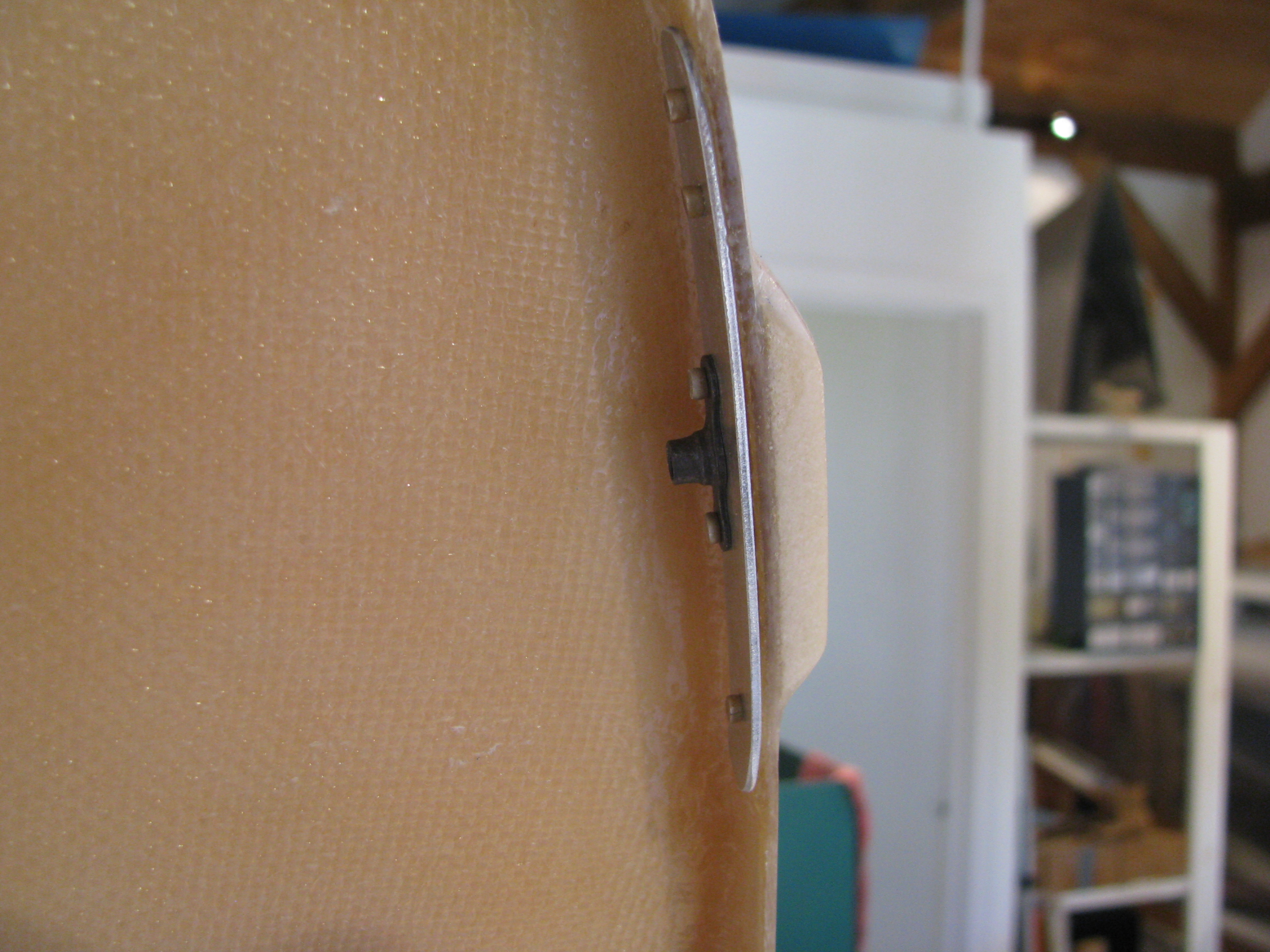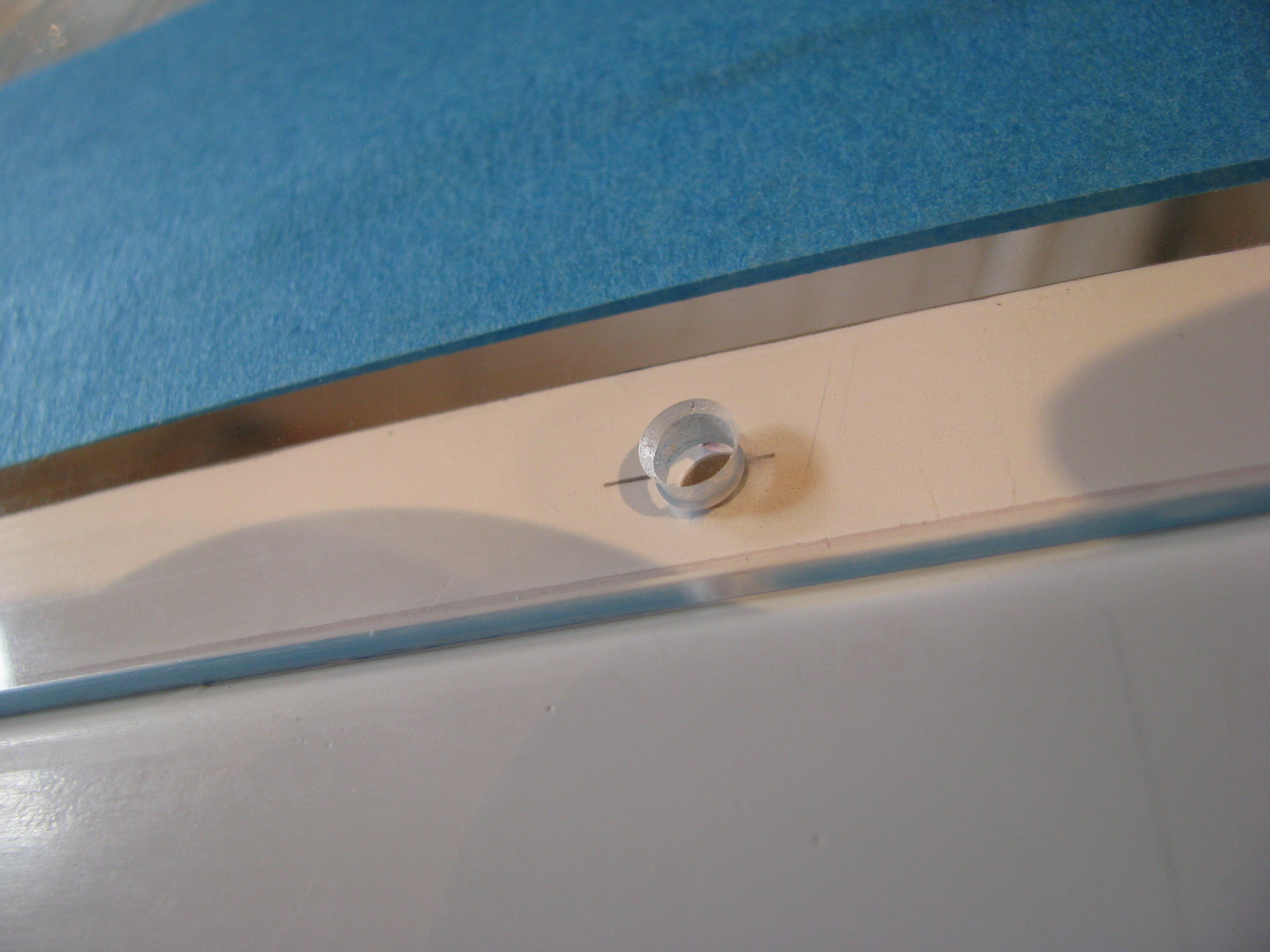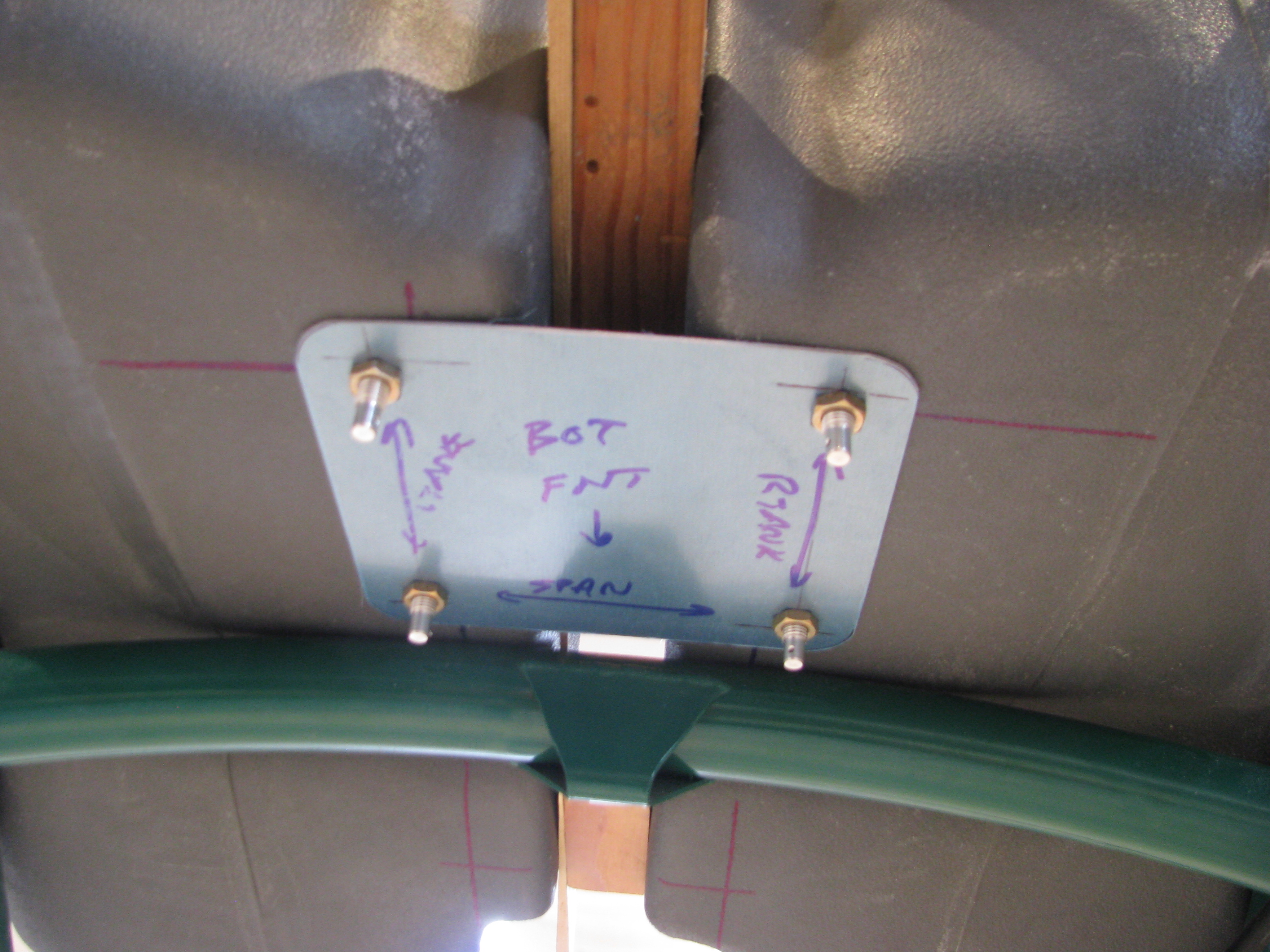 Invariably the spar is not precisely on the measured and marked centerline. Using this trick the magnet pushes a line of ink and gives you the exact drill point. This one is toward the end of the fin and is off the measured line by about 1/16th of an inch.