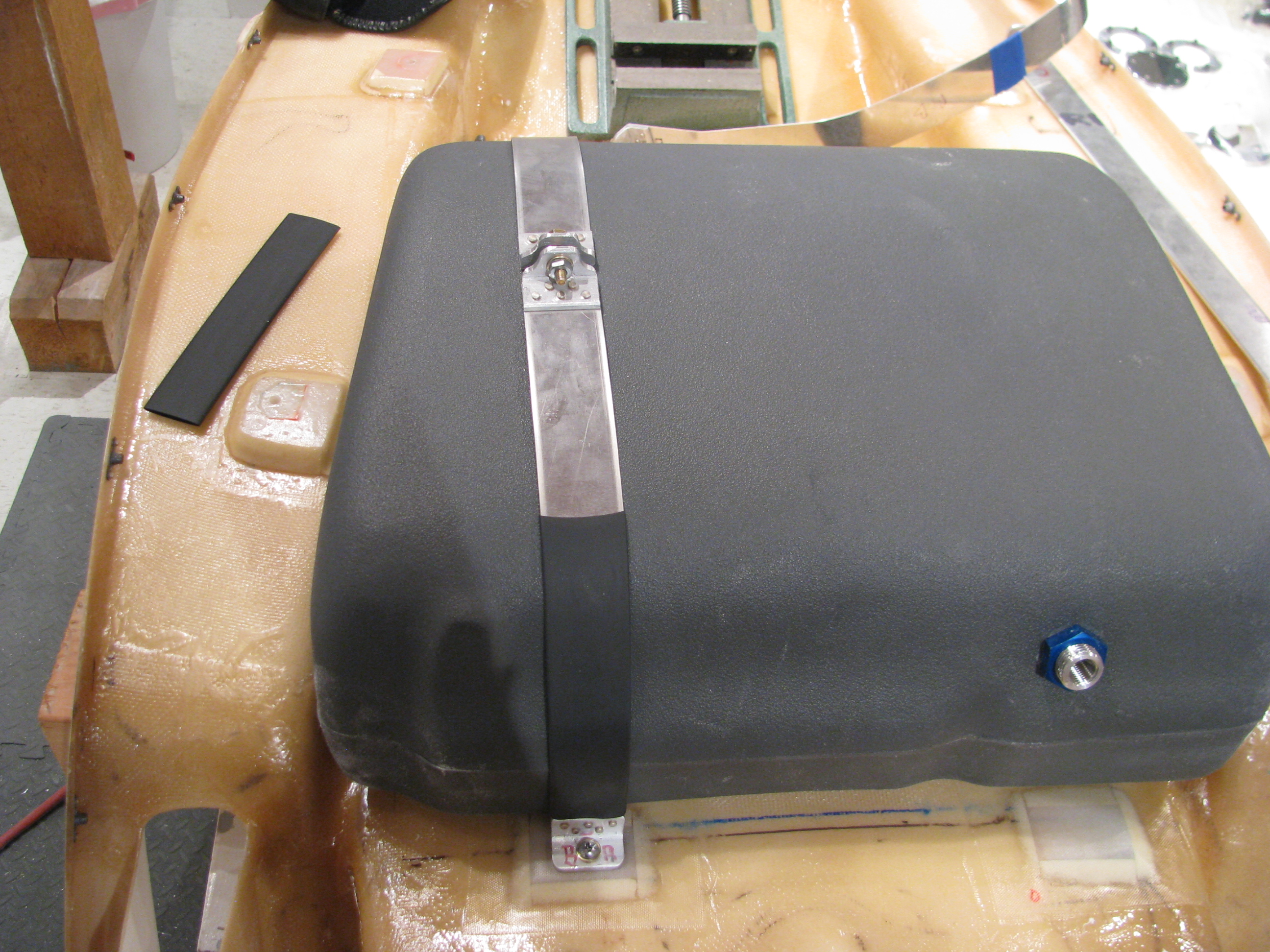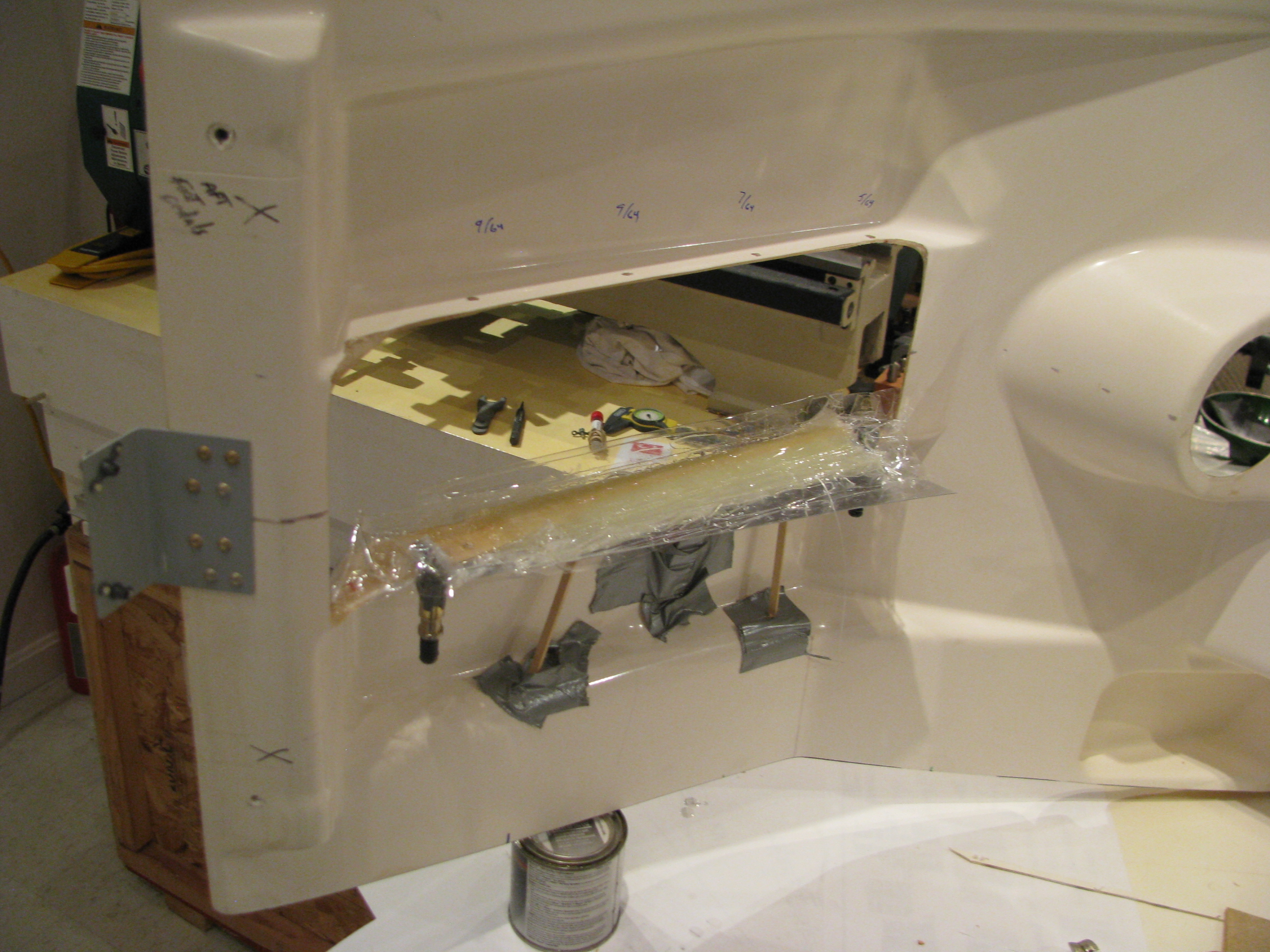 I made little U-shaped dams out of urethane foam to contain the flox "pads" for the seatpan mounting tabs. The foam was tacked down with 5-minute epoxy, then the flox was mixed and poured into the cavity. Flox is much thicker than resin, but still thin enough to flow, so you have to either pour it flat or contain it.