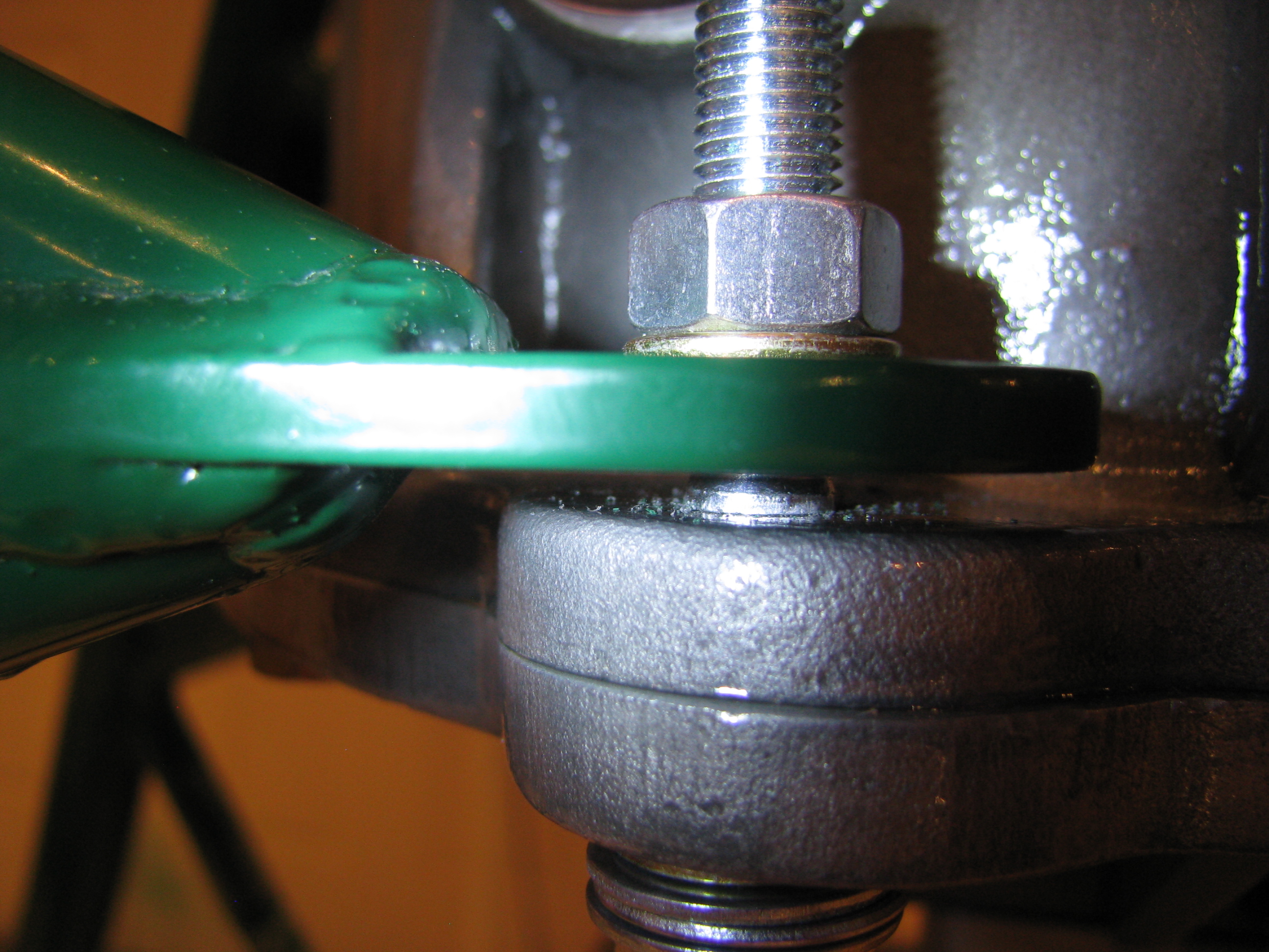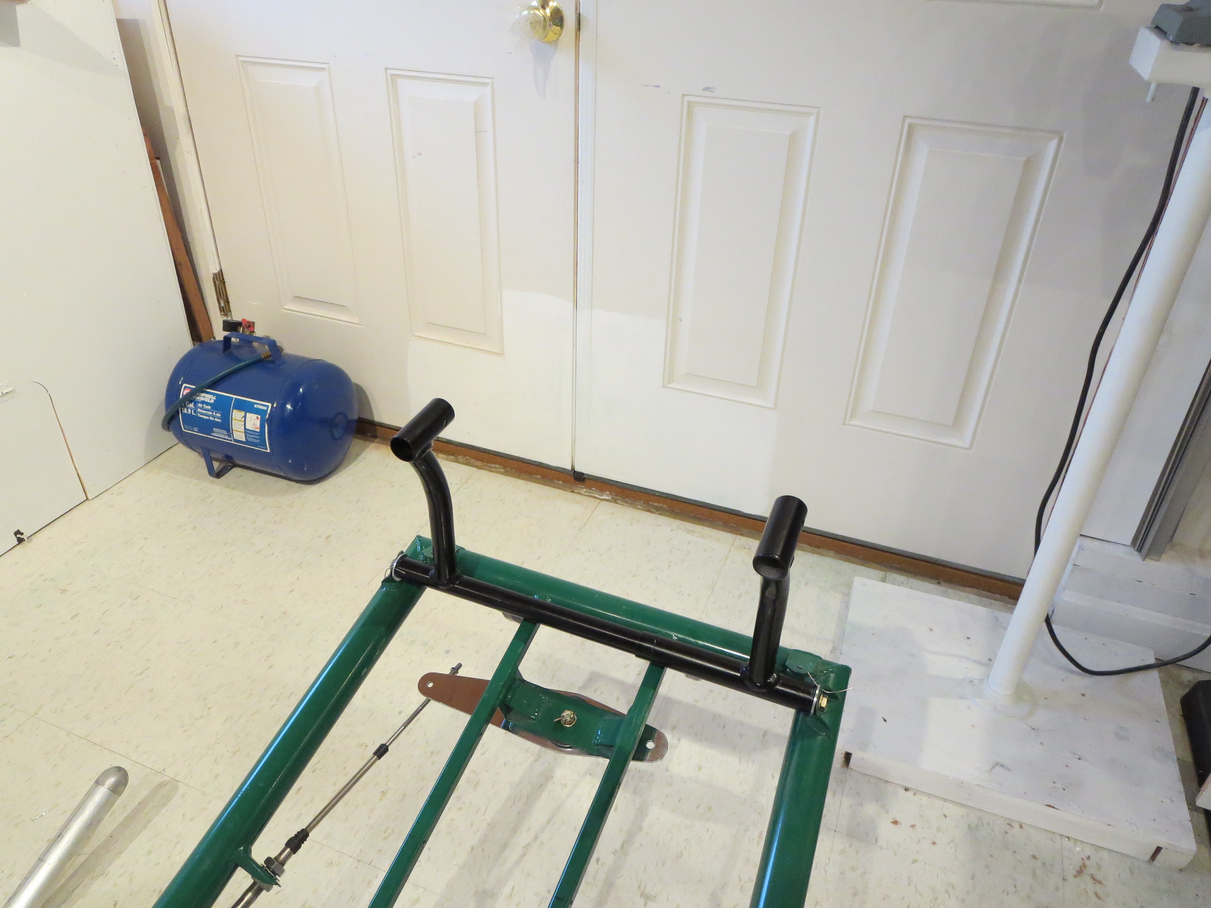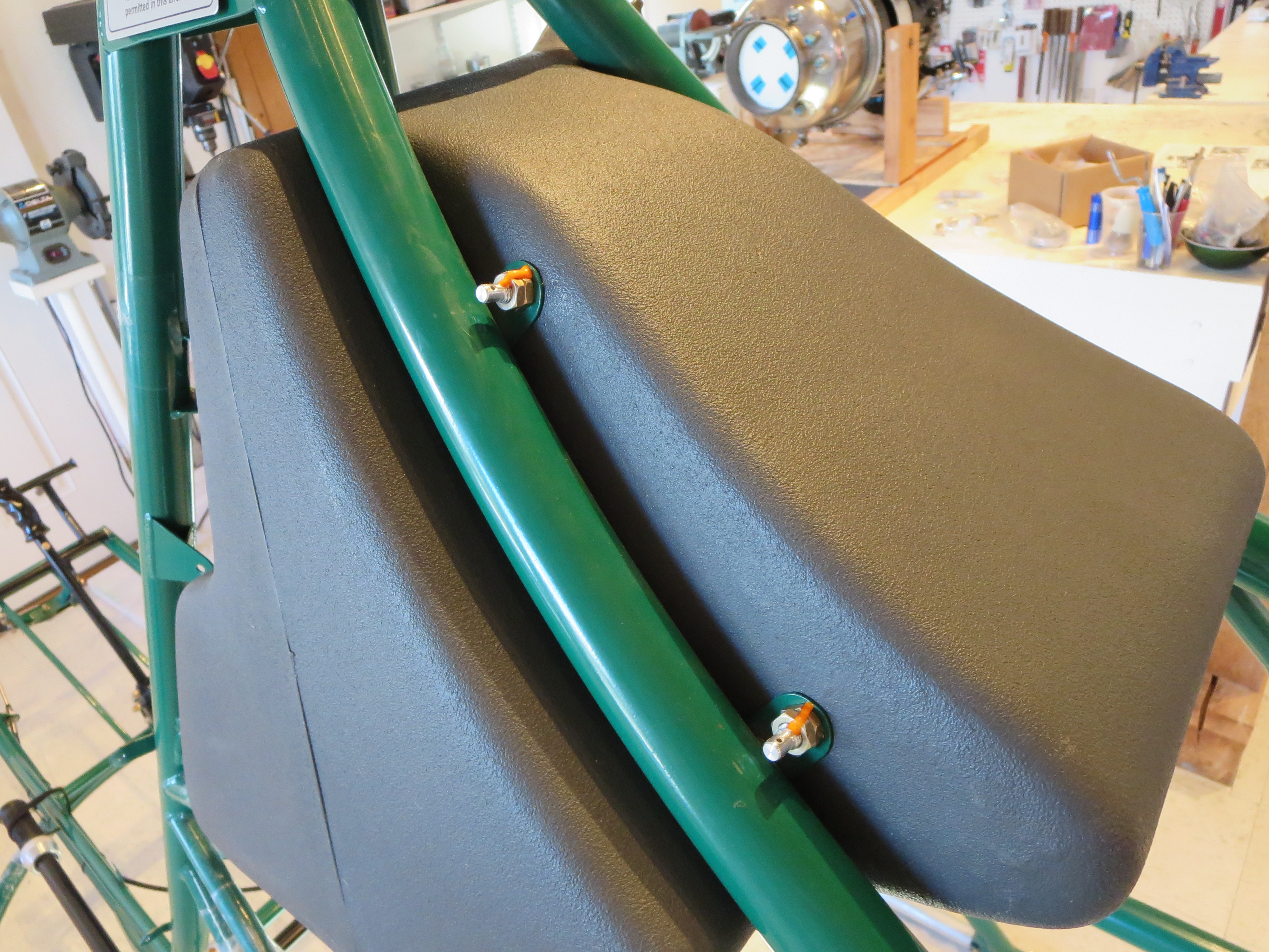 Shown here is the grinding I had to do on the control bracket to clear the seat pan as specified in the video. Still seems to be plenty of meat between the hole and the ground edge. There's about 1/16 of an inch clearance between it and the seat pan. I DO plan on repainting the frame after all the preliminaries are done just prior to final assembly. Green - what was he thinking?