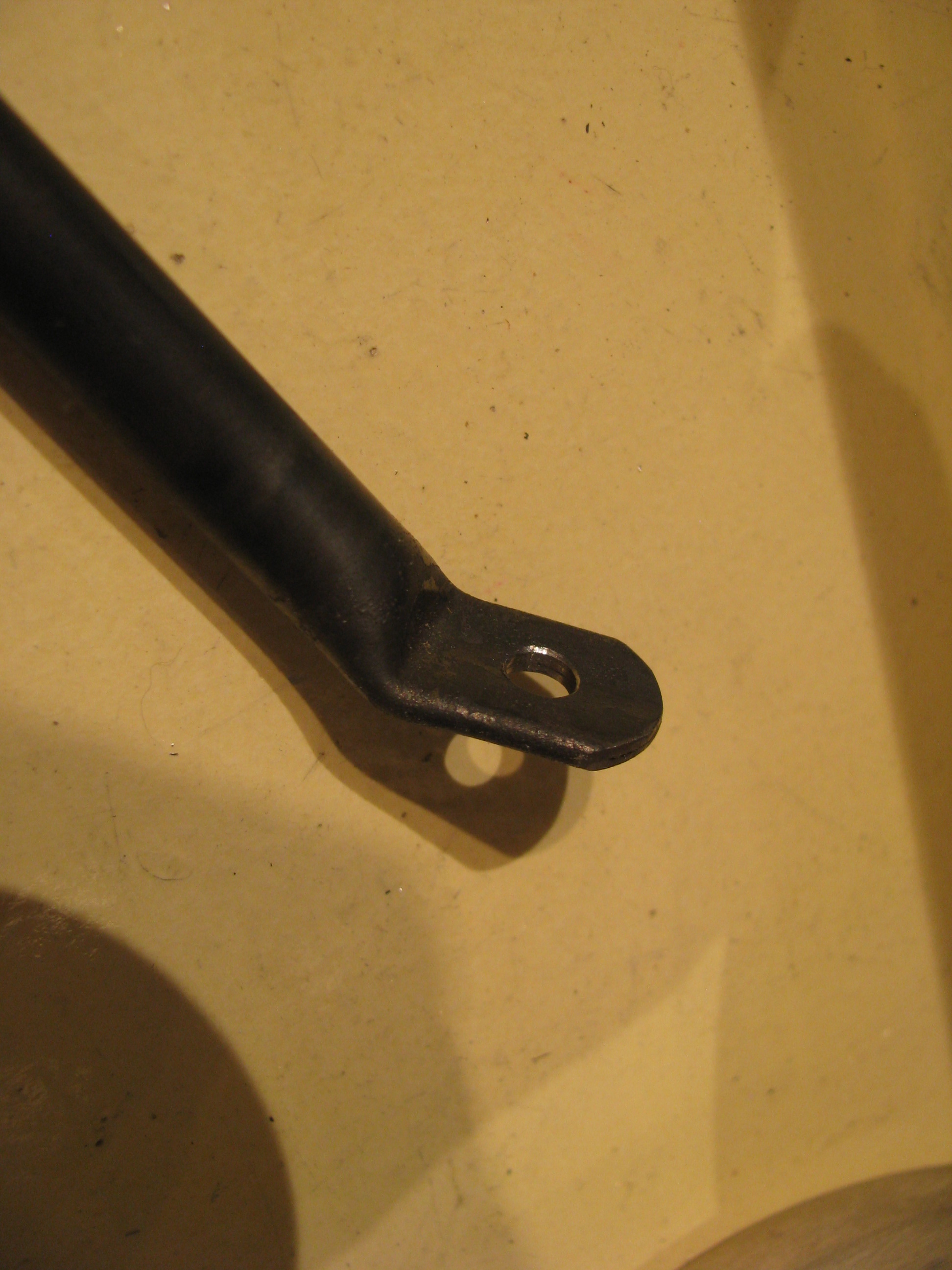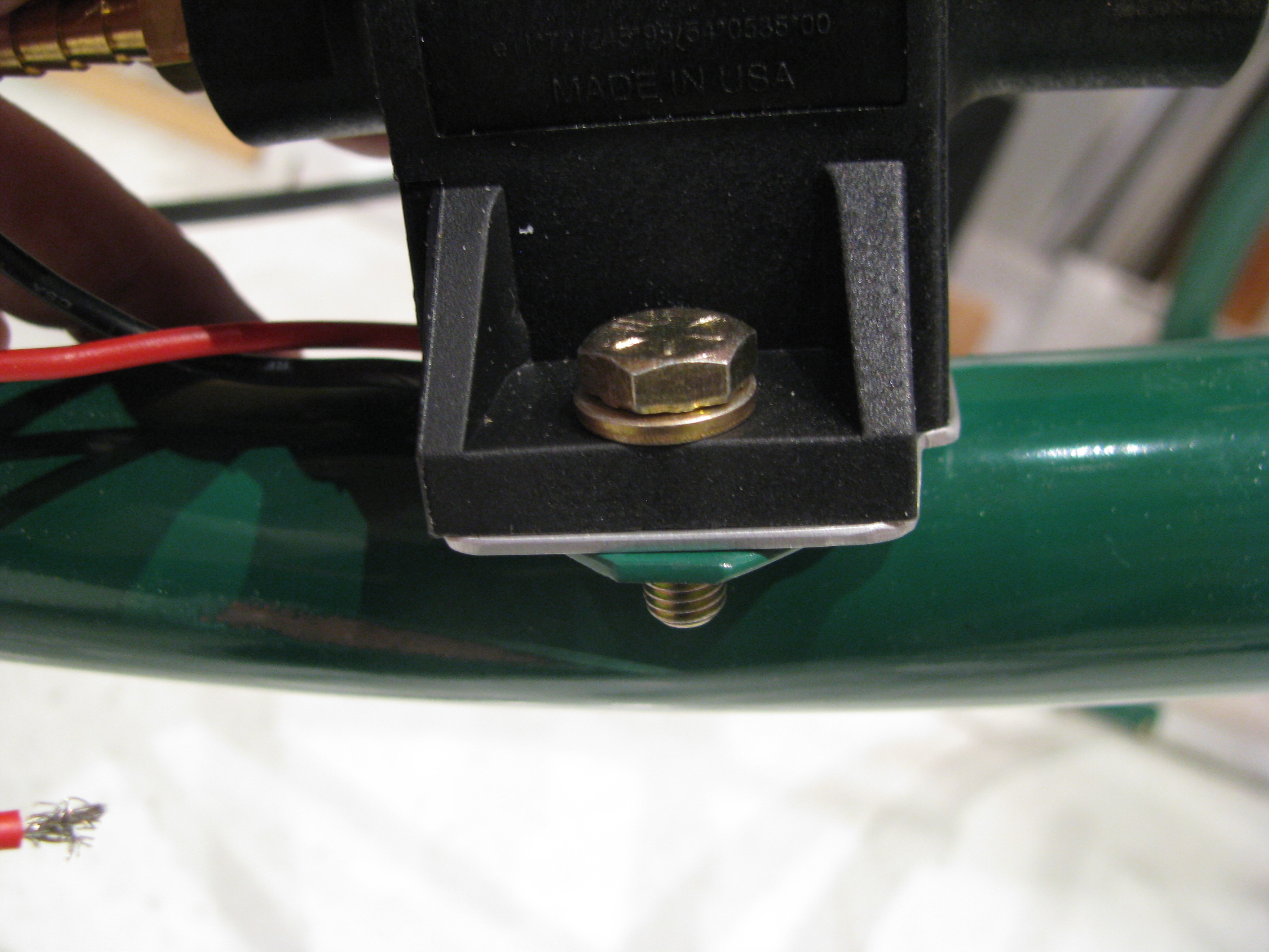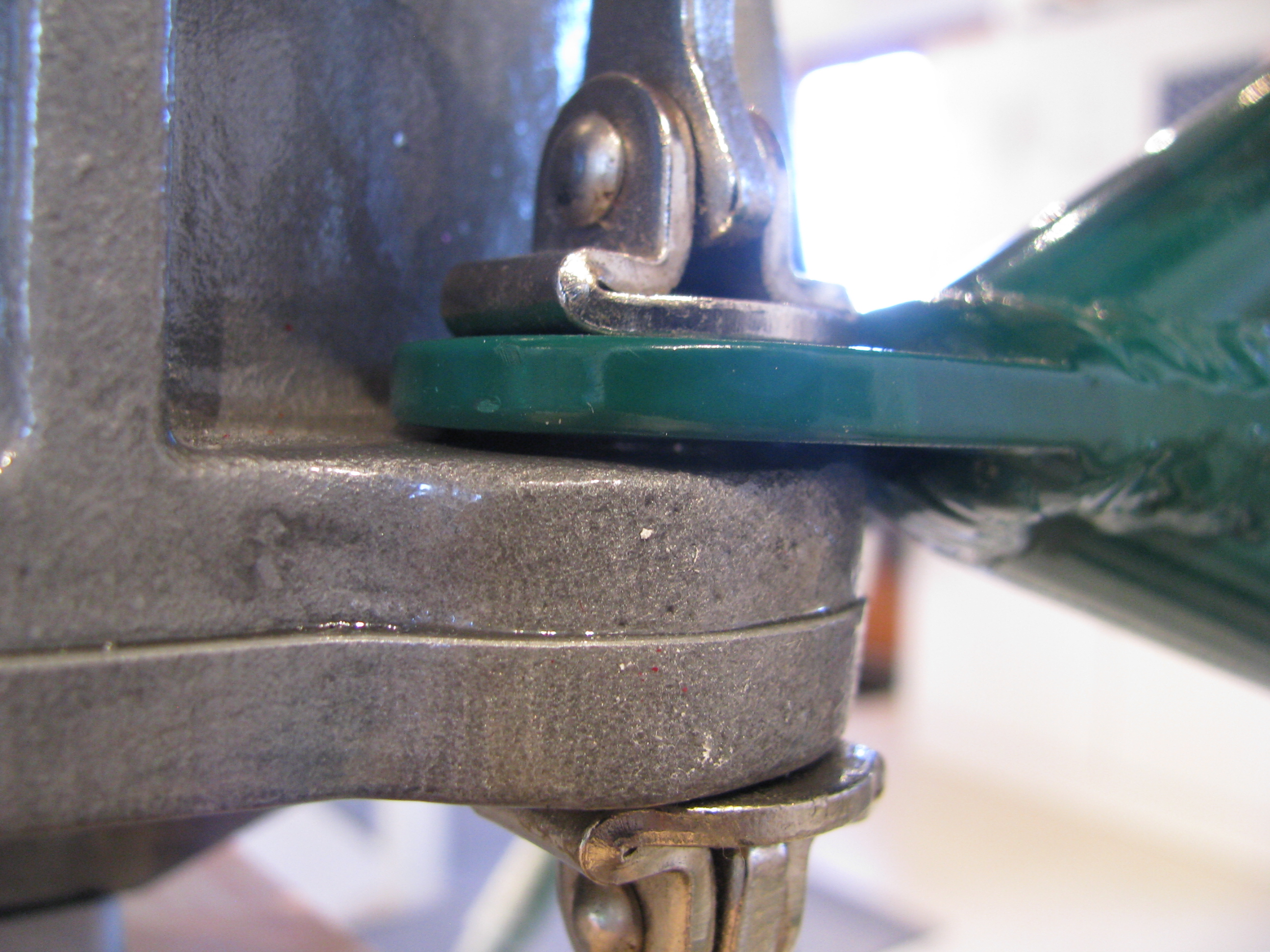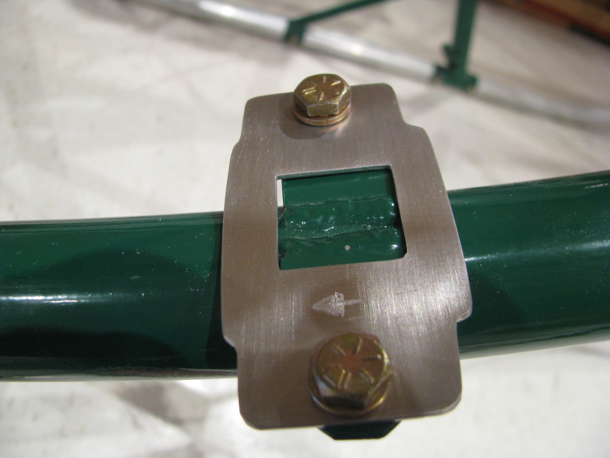 Shown here is the grinding I had to do on the control bracket to clear the seat pan as specified in the video. Still seems to be plenty of meat between the hole and the ground edge. There's about 1/16 of an inch clearance between it and the seat pan. I DO plan on repainting the frame after all the preliminaries are done just prior to final assembly. Green - what was he thinking?