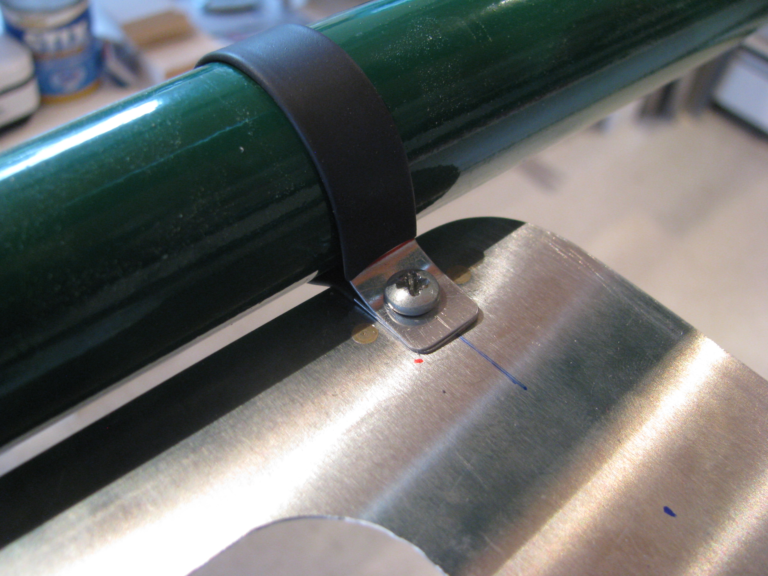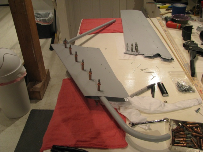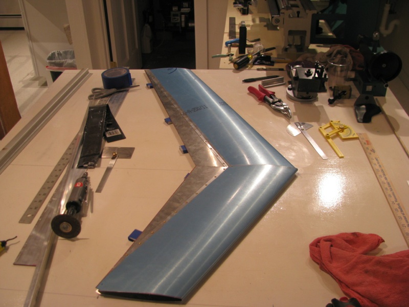 The fins use a prefabricated airfoil section that has to be cut per the plan, then fit to the steel tube spar. Cutting to shape was no problem, but I committed my first helicopter part butchery on the lower section. The tube spar has a curved lower section. In jamming it through the airfoil section I made a faint crease in the very thin aluminum skin. What I should have done is drill out the lower rivets to allow for easier fitting and riveted it back together on final assembly at the end. Oh well. Apparently I am not the first to have done this.