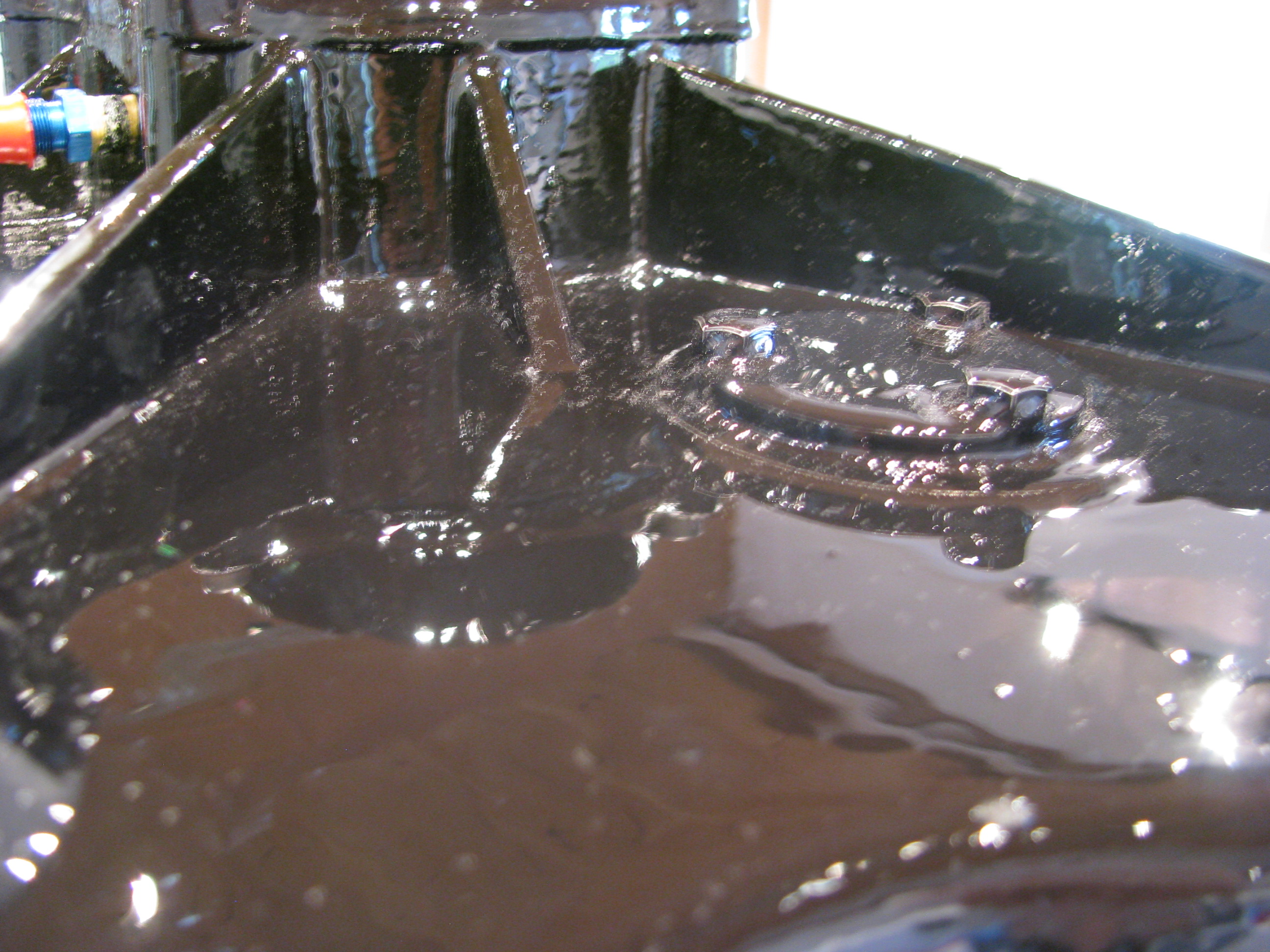 I broke out my Eastwood 2-part epoxy primer for a quick couple of coats to seal the rear of the pan. This stuff flows nicely and surprisingly almost exactly matches the color of the plastic used on the fuel tanks.