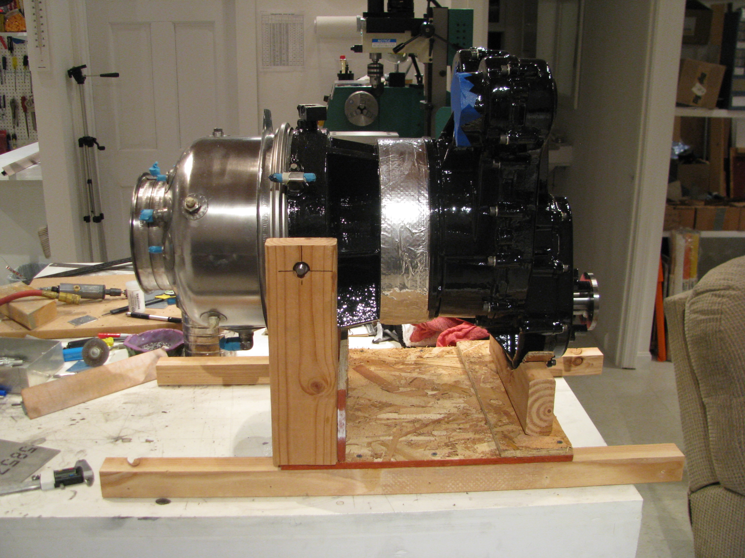 Then I tried lifting the engine with my pulley system. Two problems; 1) The rope was quite stretchy. I can't imagine trying to position the engine precisely with this system., and 2) Seeing the engine dangling from a few thin strands was too nerve-wracking. That's 10-15K worth of turbine swinging on some home-depot rope.