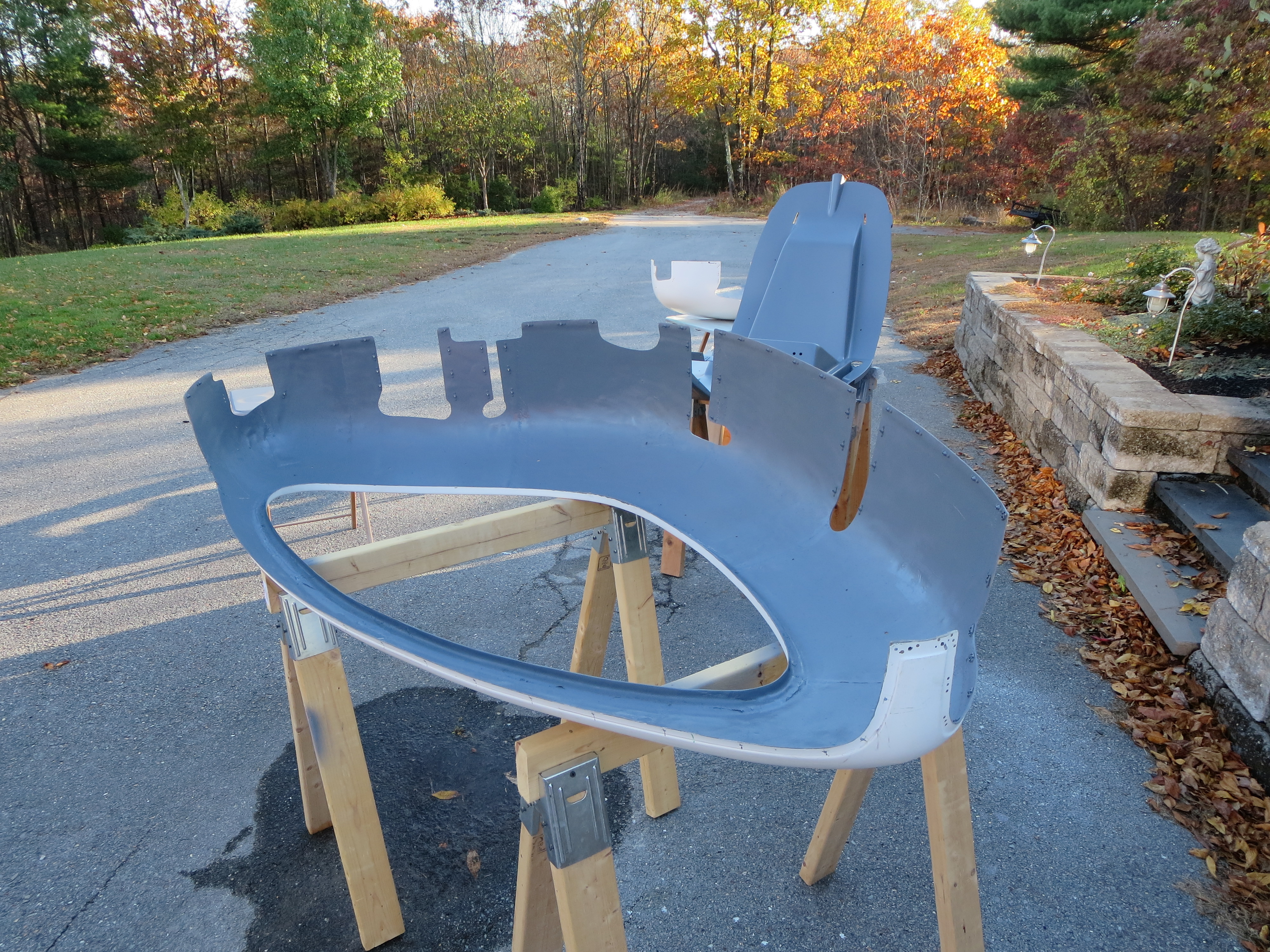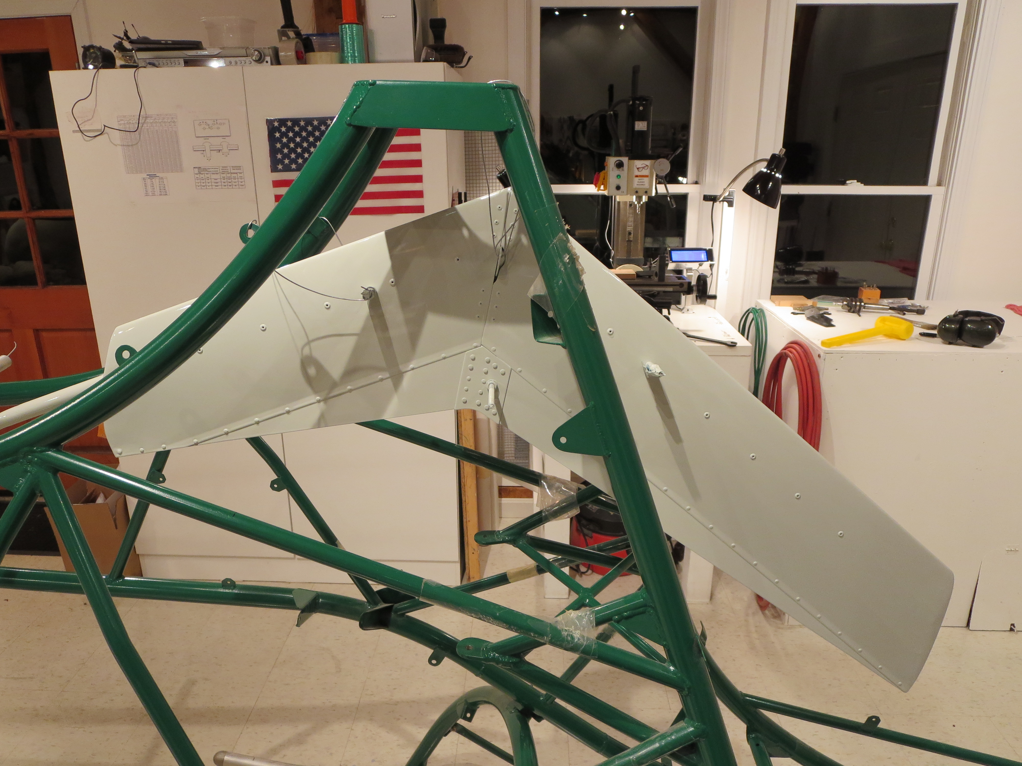 Here are the pieces coming together for the final time before riveting. You can see where I drilled out the lower rivets of the lower section so the curved tube would fit through without damaging the thin skin.