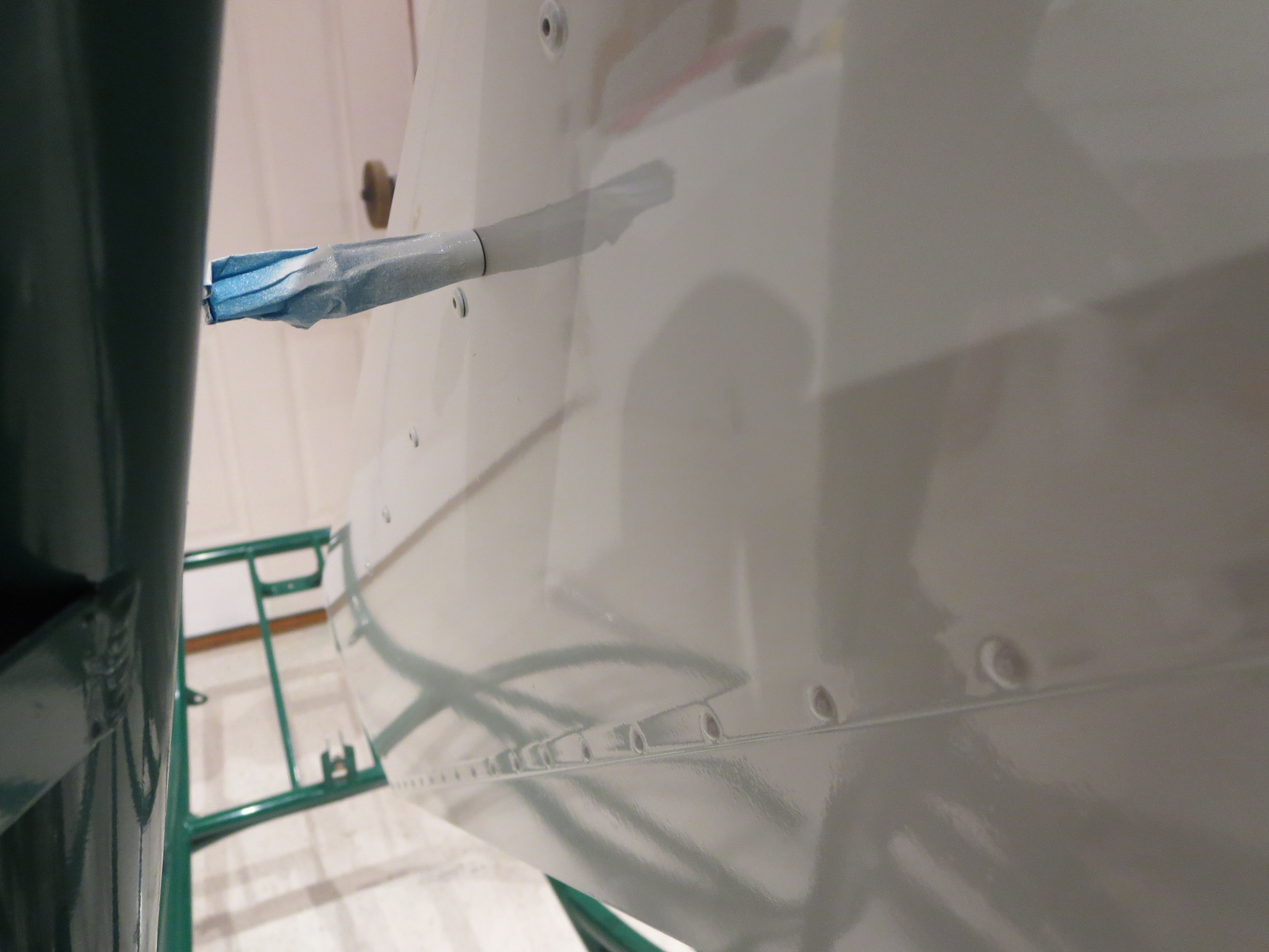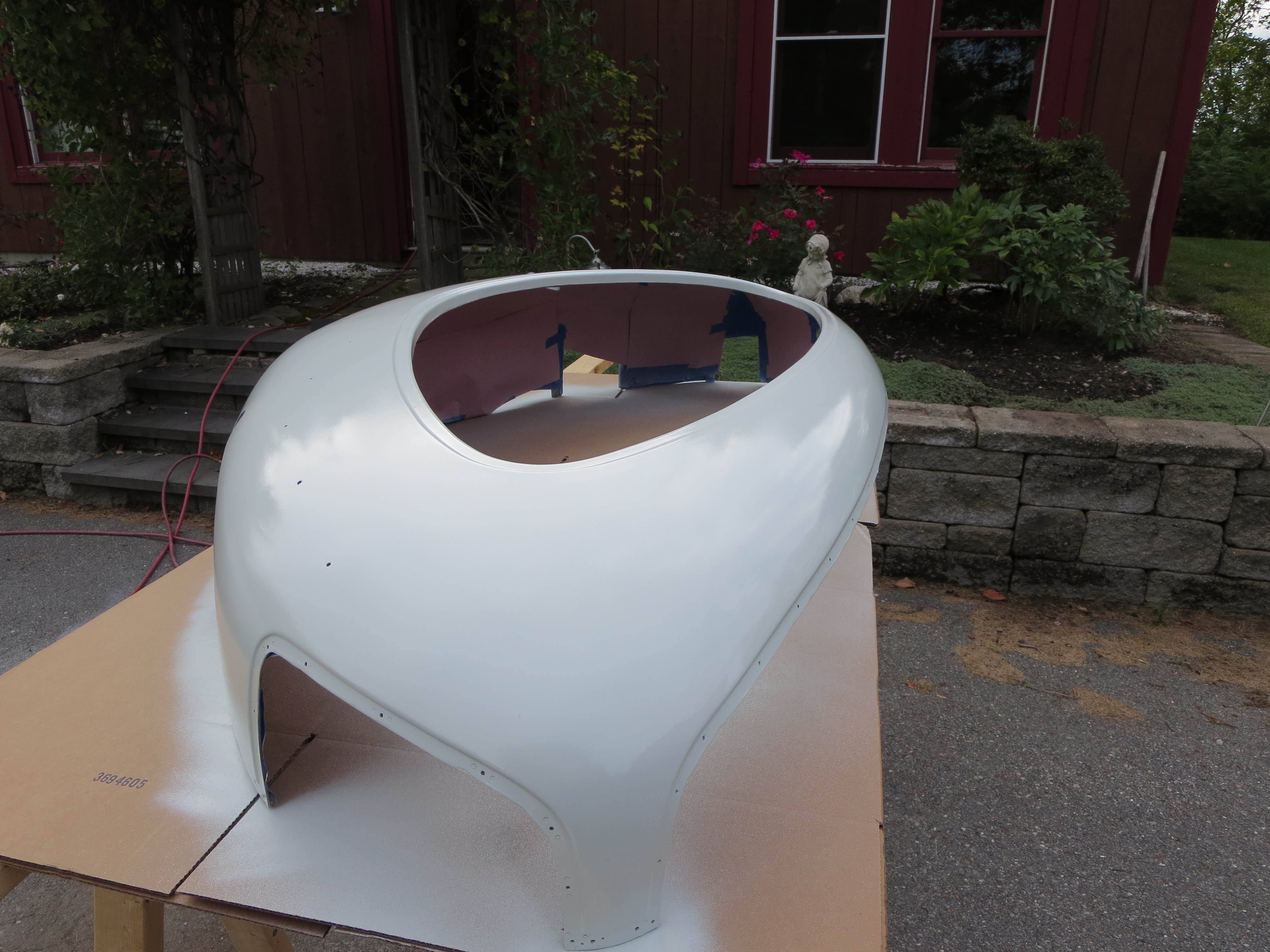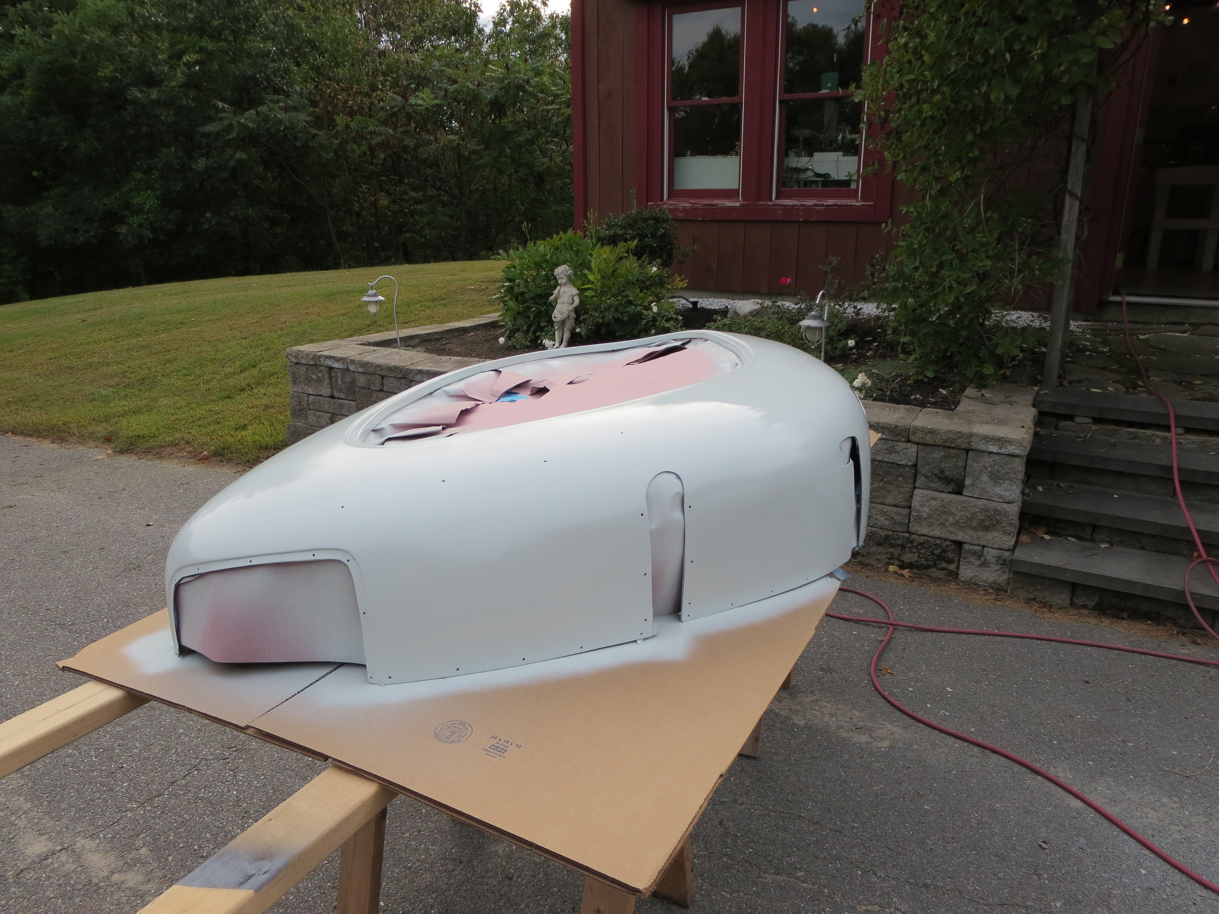 When I painted the fins I was impressed with how nicely the urethane paint "flowed-out", and leveled itself, creating a glass smooth surface. So I jumped in to the cabin exterior using the skills and techniques I thought were developed at this point. The surfaces were primed, wet-sanded, masked and cleaned well. No problems. I used the same gun that I used for the fins.