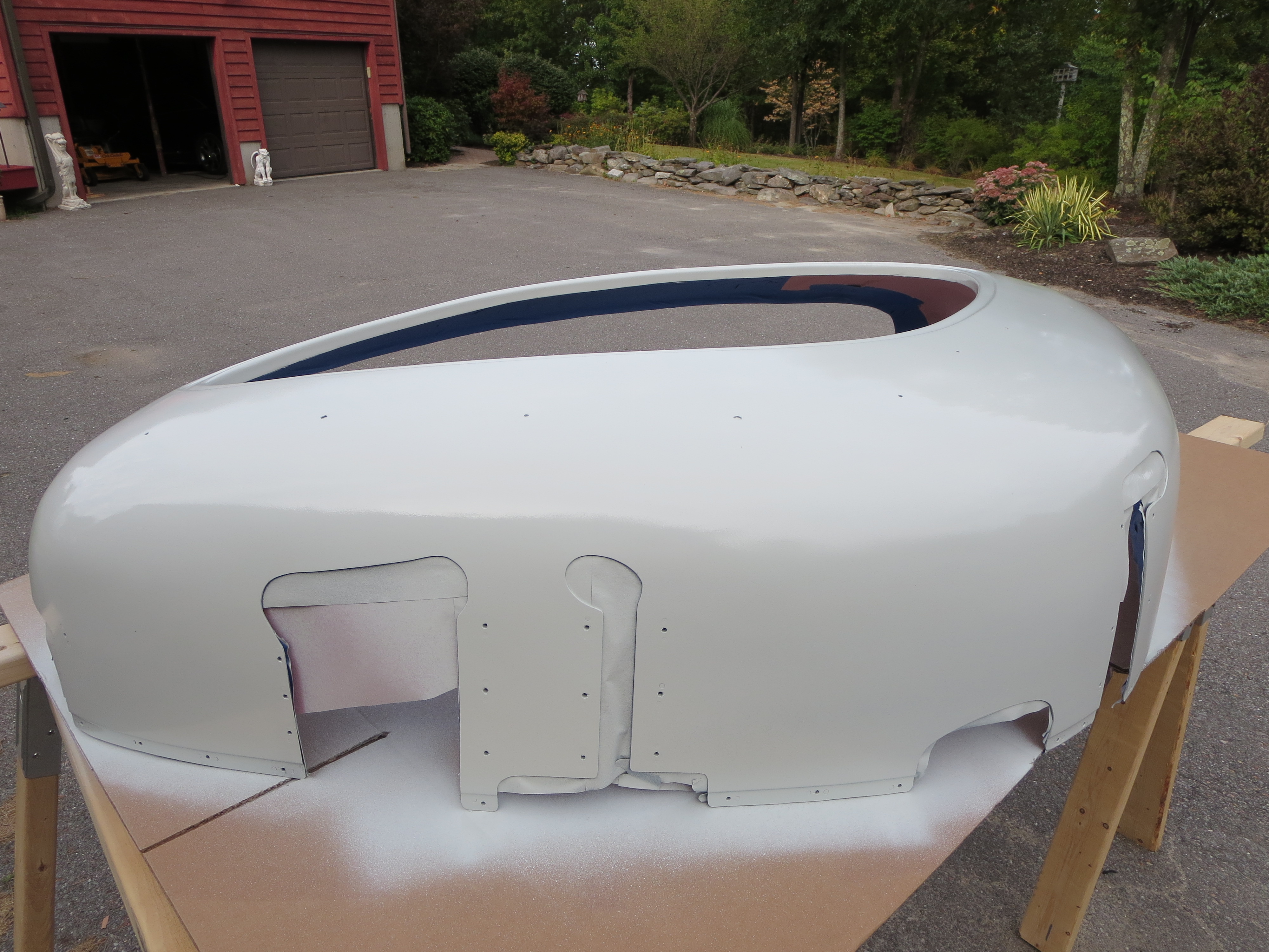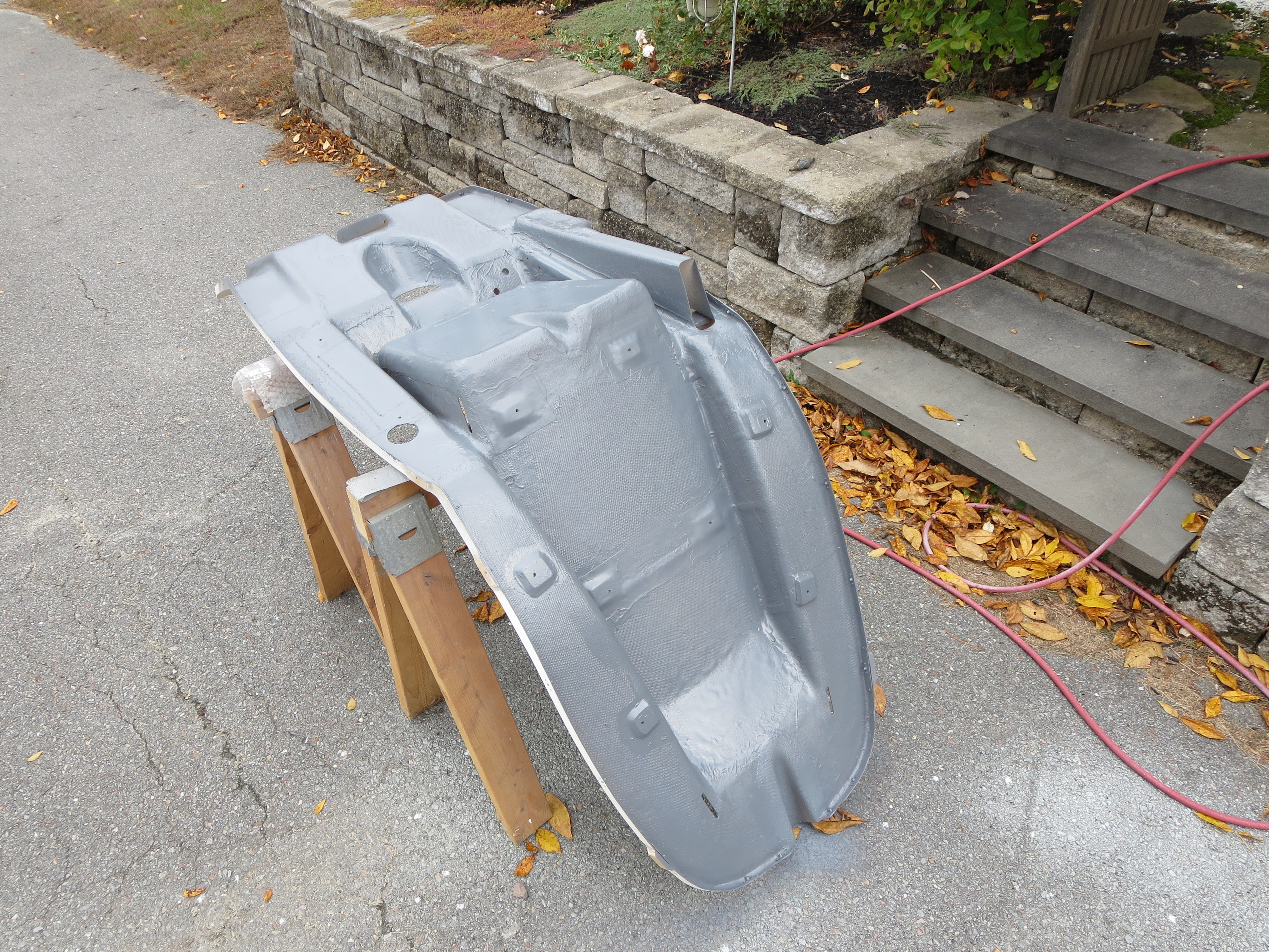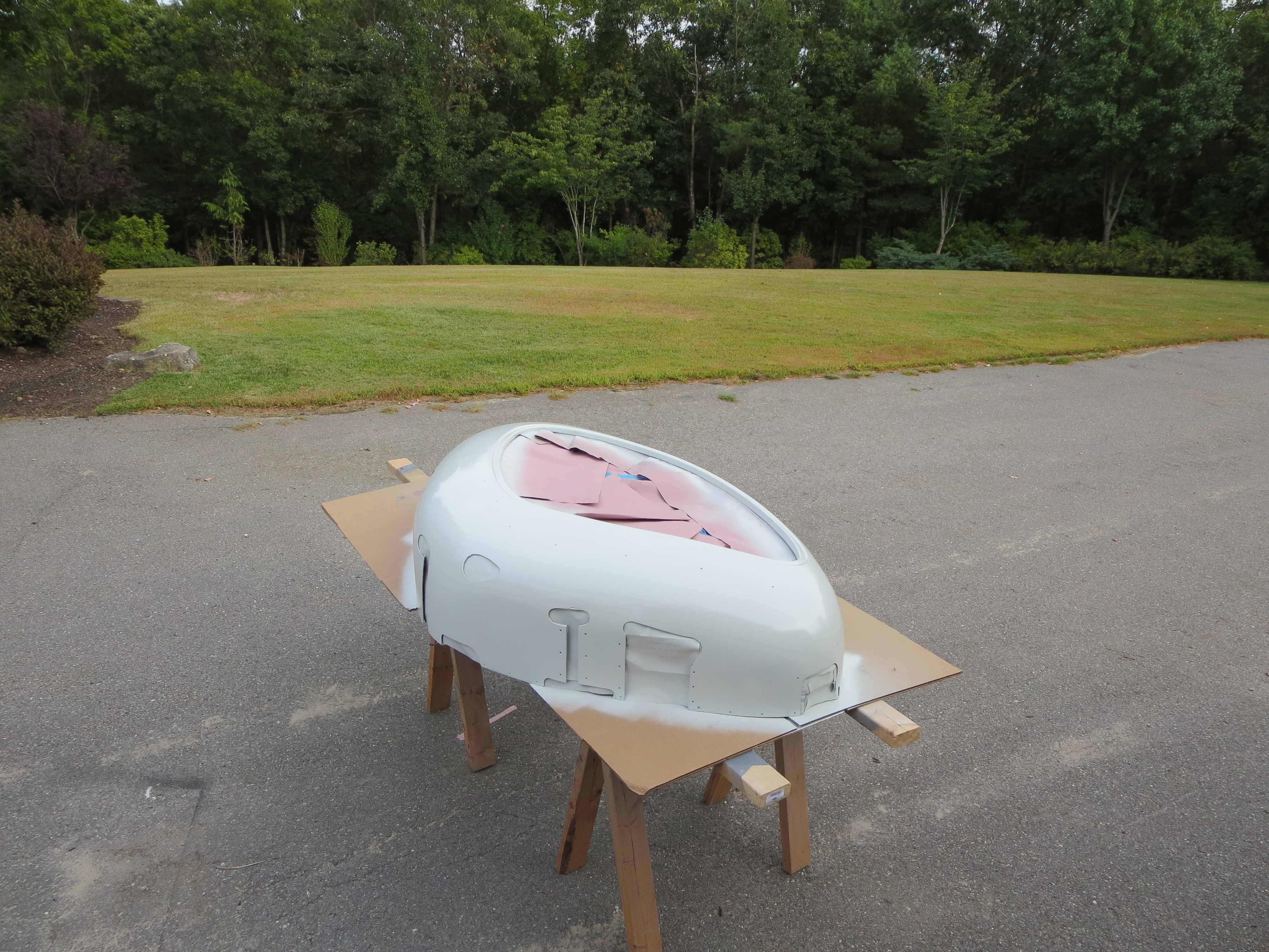 I had, at one point, considered lining the cabin interior with a fabric, but quickly dismissed it as weighty and labor intensive for limited gain in looks. To keep it simple and light, I lightly sanded it to remove the high-stranding fiberglass artifacts, then primed with the epoxy grey. I did not bother to fill the weave, or anything like that.