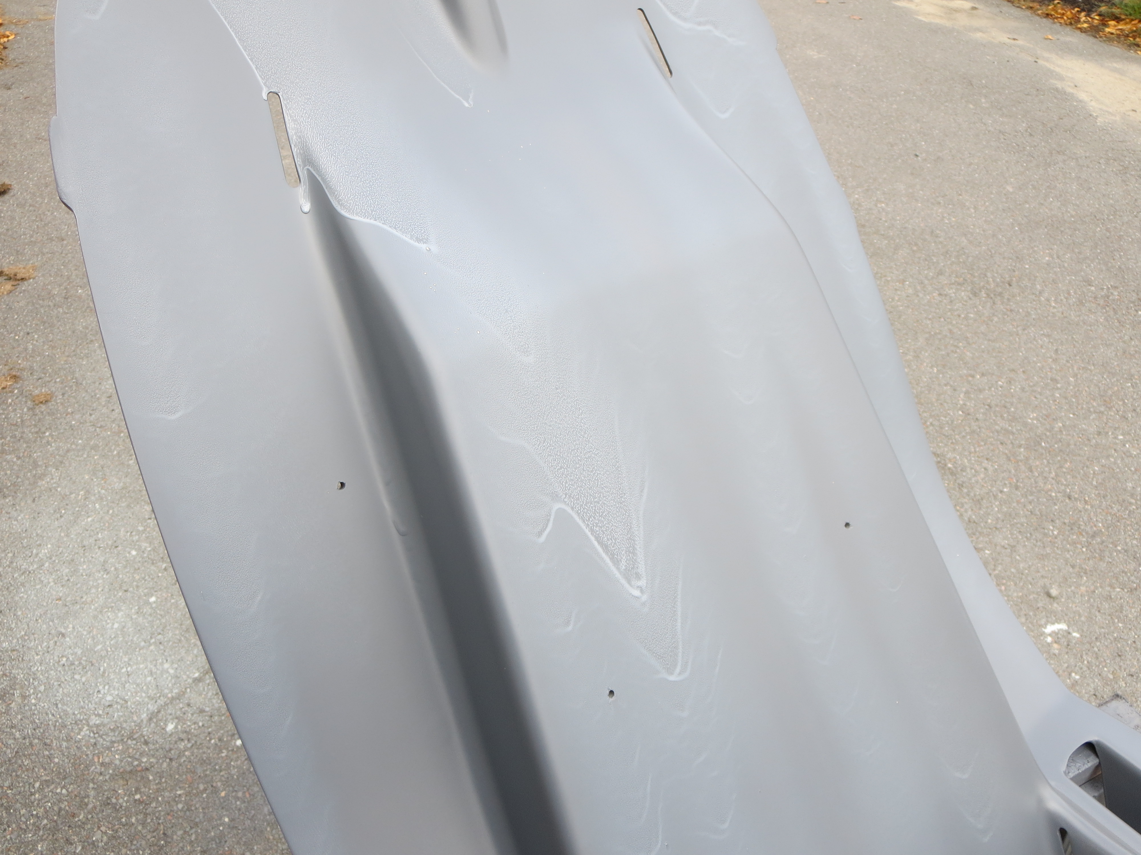 Conclusion: Weather, weather, weather. Whereas when I primed the rear of the pan, the day was sunny and dry, the day I did the top side was cloudy and overcast and the humidity was relatively high. It was supposed to rain that afternoon and I wanted to get the primer on before it turned wet. Because of the moisture in the air and the lack of sun I think two things happened. 1) When I did my final wipedown with IPA, it never evaporated all the way. I think that is why the panel has the dimples. There was still residual IPA in the pores of the aluminum. 2) Because of the moisture and lack of sun, the primer did not dry or flash as quickly. The longer to stayed on wet, the more it sagged and ran.