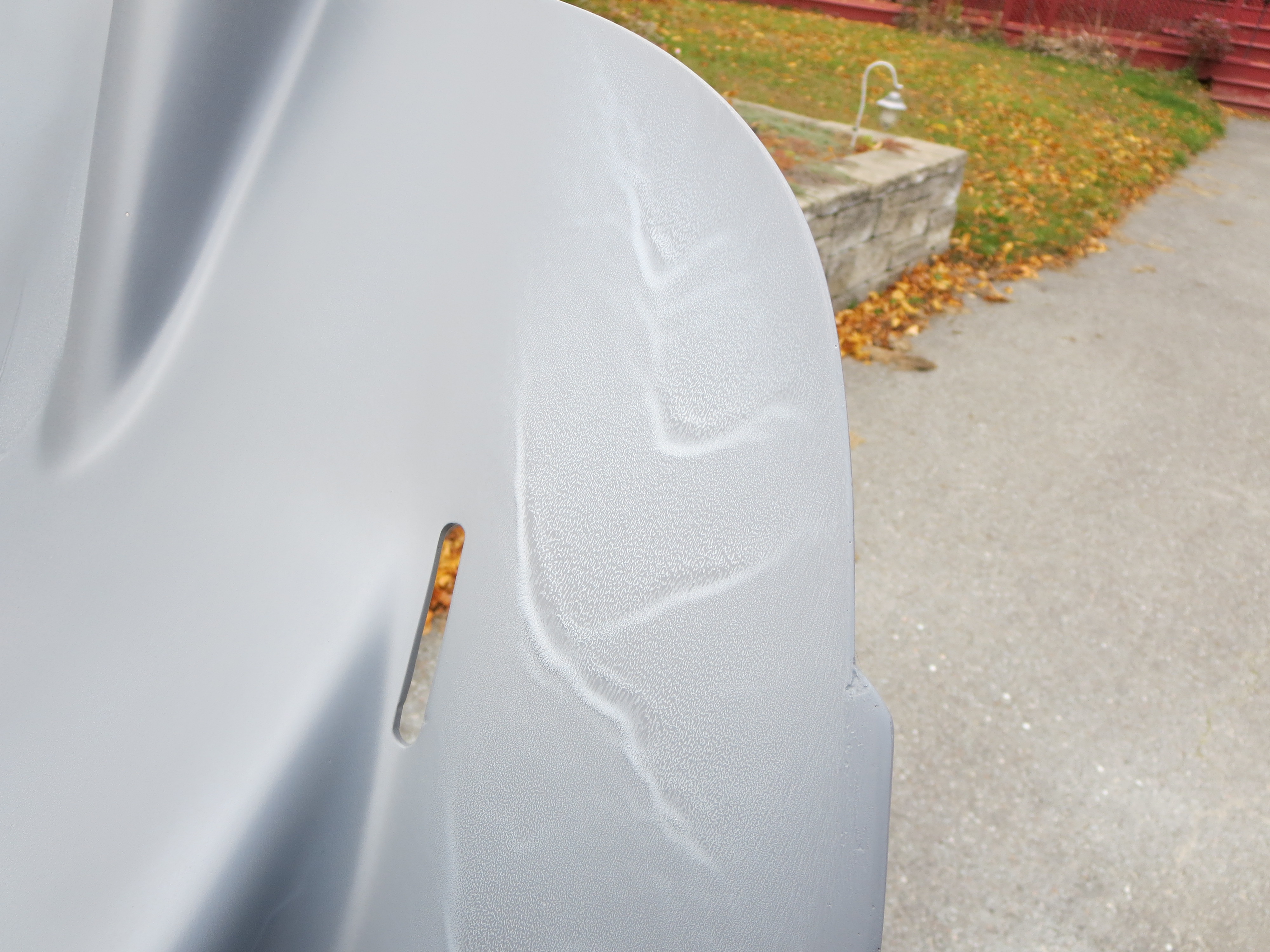 The next two weeks of evenings were spent with a spray bottle of water, sandpaper and dual-action orbital polisher. Start with 500 grit (yes 500 grit for real), wet sand, then work to 800, 1000, 1200, 1500, and then 2000. Follow that with a multiple passes of the polisher with an aggressive cutting compound. Wipe it all off, look at it with a bright light and repeat, starting with the coarse grit on up. Repeat. Repeat. Repeat.