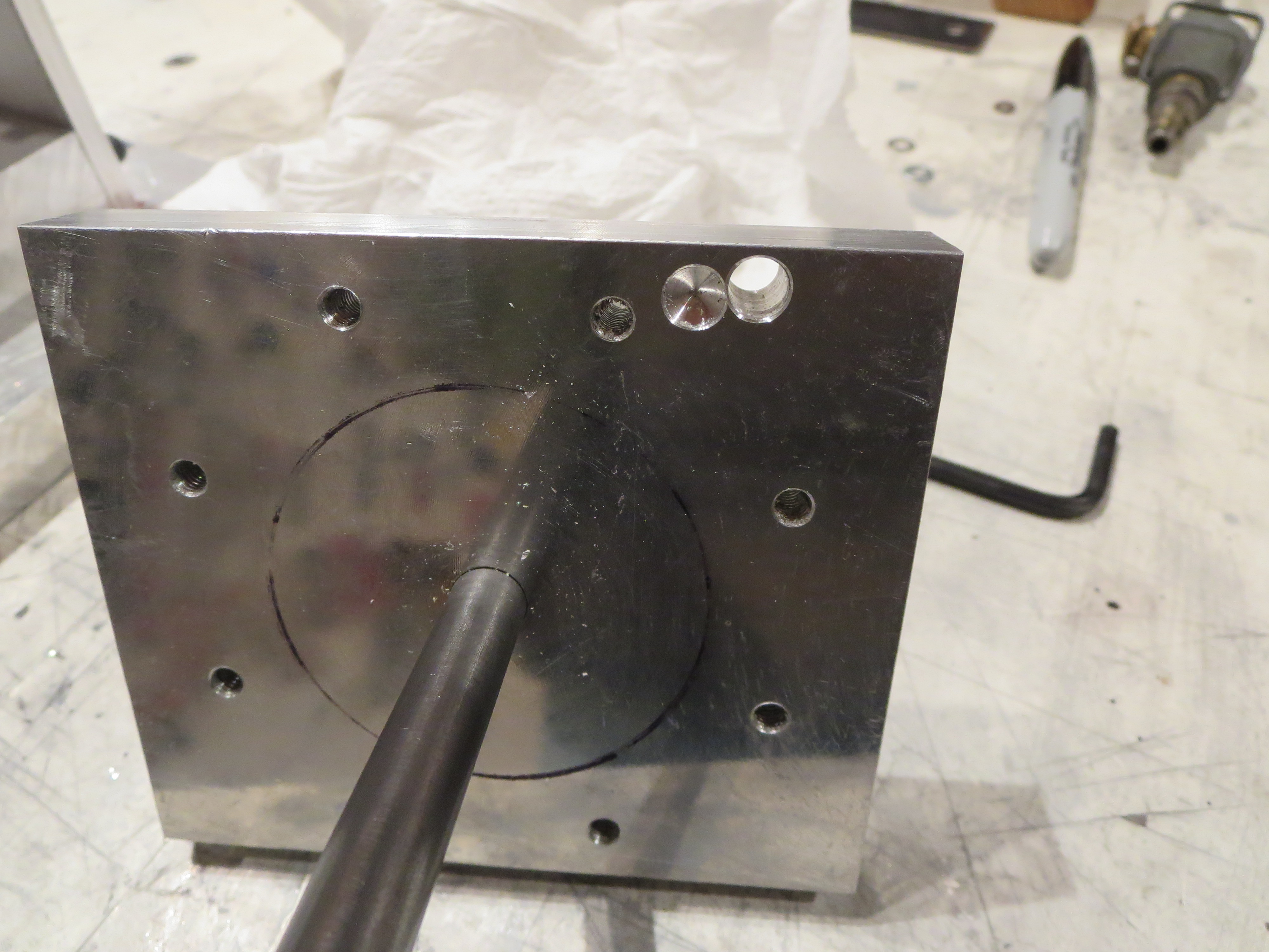 Next, the carrier assembly itself has to be balanced as perfectly as possible and the jig leveled. The through hole and the partially drilled hole achieved that balance. There were already some partially drilled holes on the other side of this block, and the drilling ops are not perfect, no matter how carefulIy it was machined. This is a very important step. When the carrier spindle is balanced you can level the jig with shims to be perfectly level. Even the tiniest of differences causes the balanced item to roll off one side or the other. It's pretty impressive how delicate/accurate this thing is.