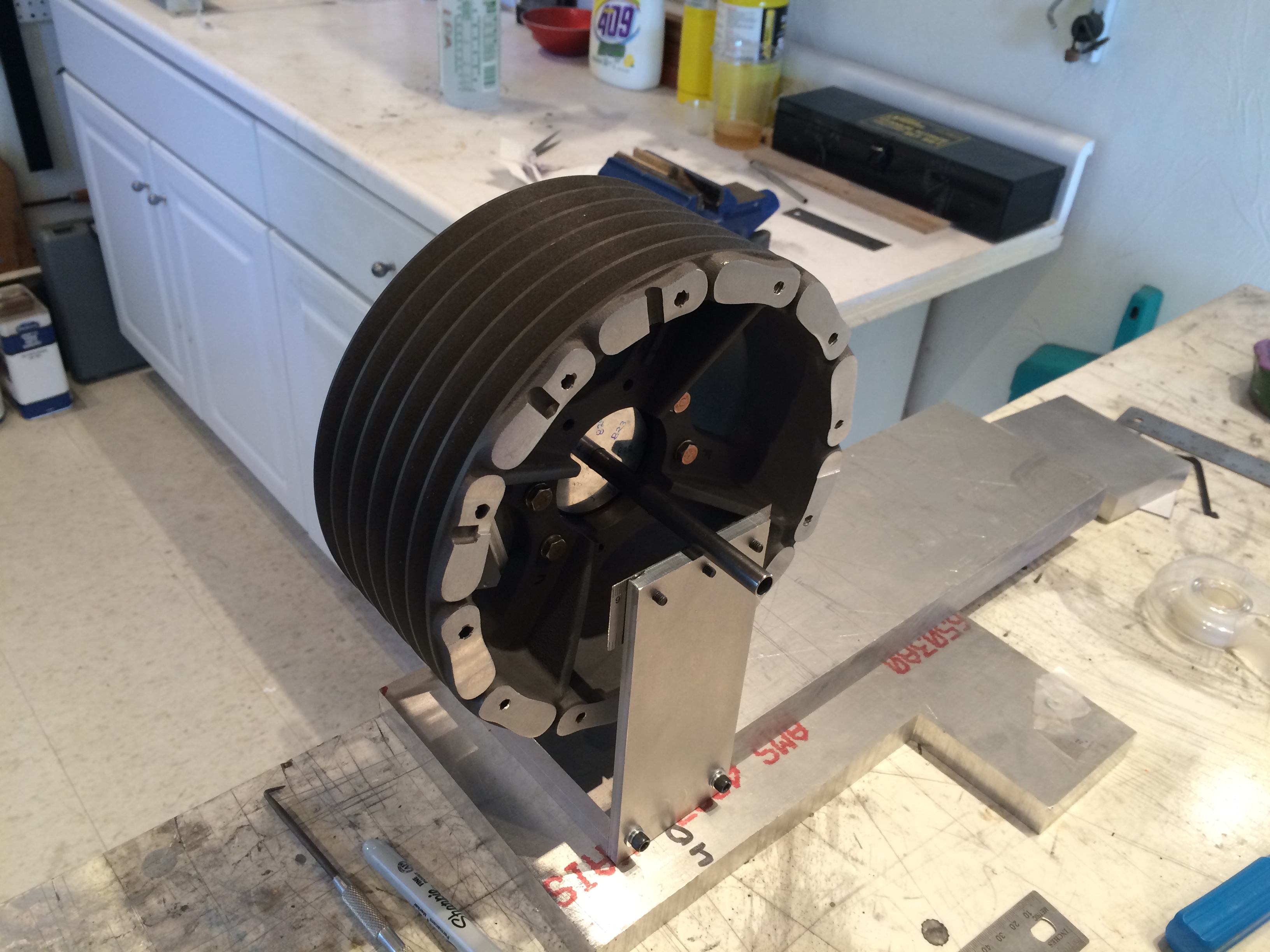 Only THEN can you start balancing the pulley. Bolt it together, see which side is down, mark it, redo the measurement with the carrier at 4 90 degree points, then draw lines across the face of the pulley. The center intersection point is the center of gravity. Since the carrier is not perfectly centering, you must do four measurements at the cardinal points and then draw the centroid. Only THEN remove material on the heavy side - a little at a time - then repeat.