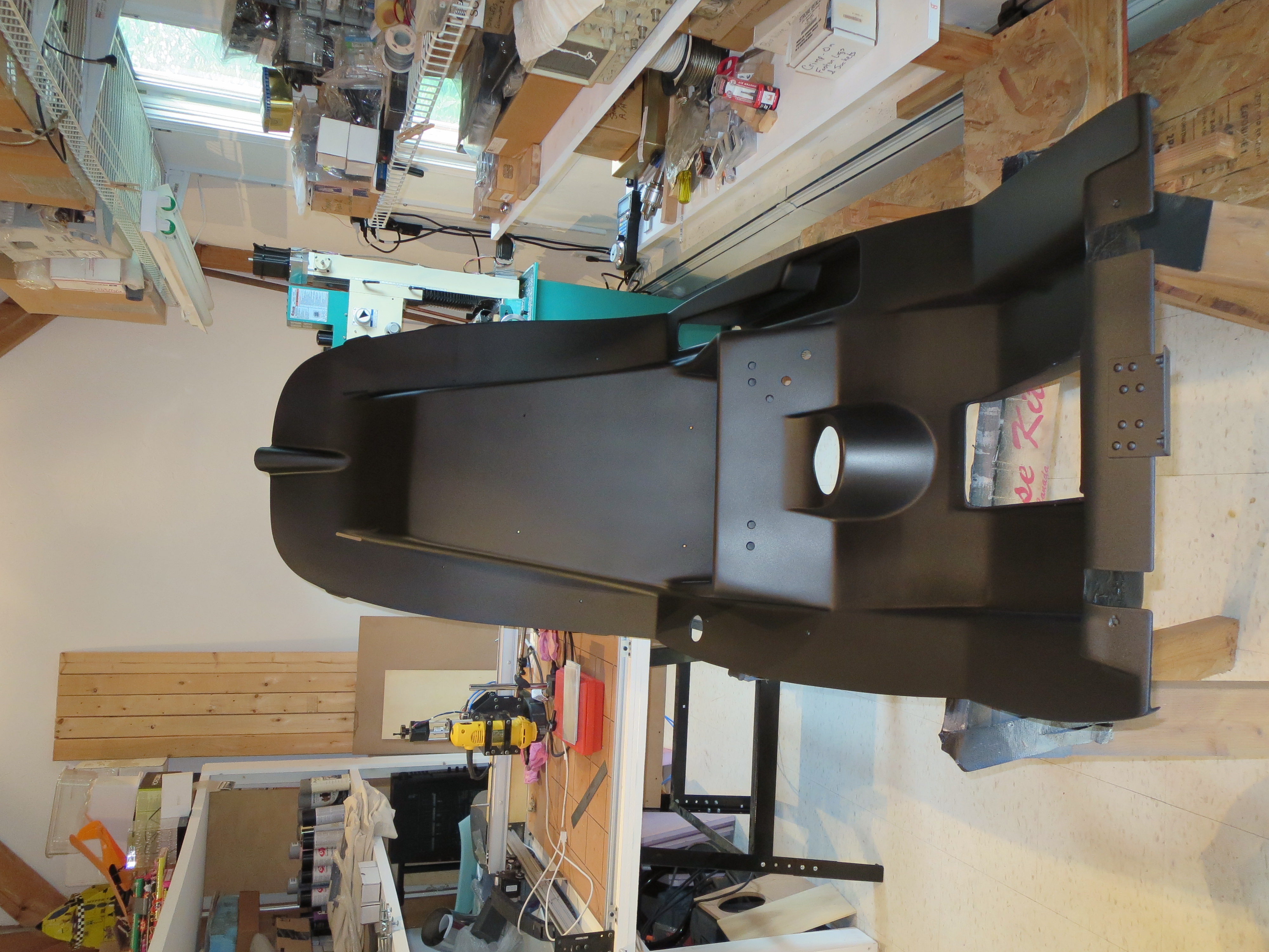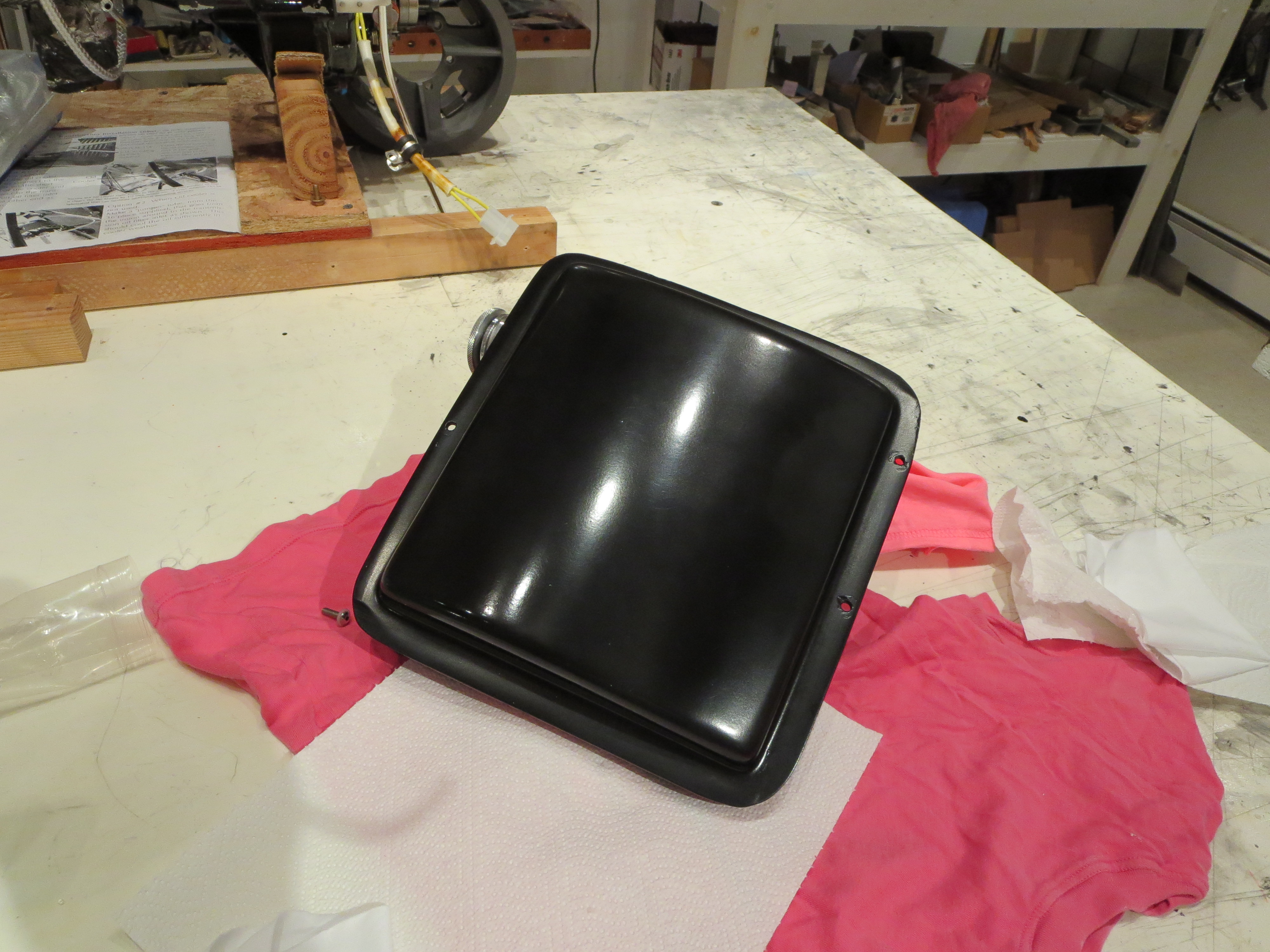 I started the final painting with the seat pan. The finish selected is satin "Rat Rod Black". This is a flat black with a little bit of texture. The intention is that there be no unwanted reflections on the canopy.