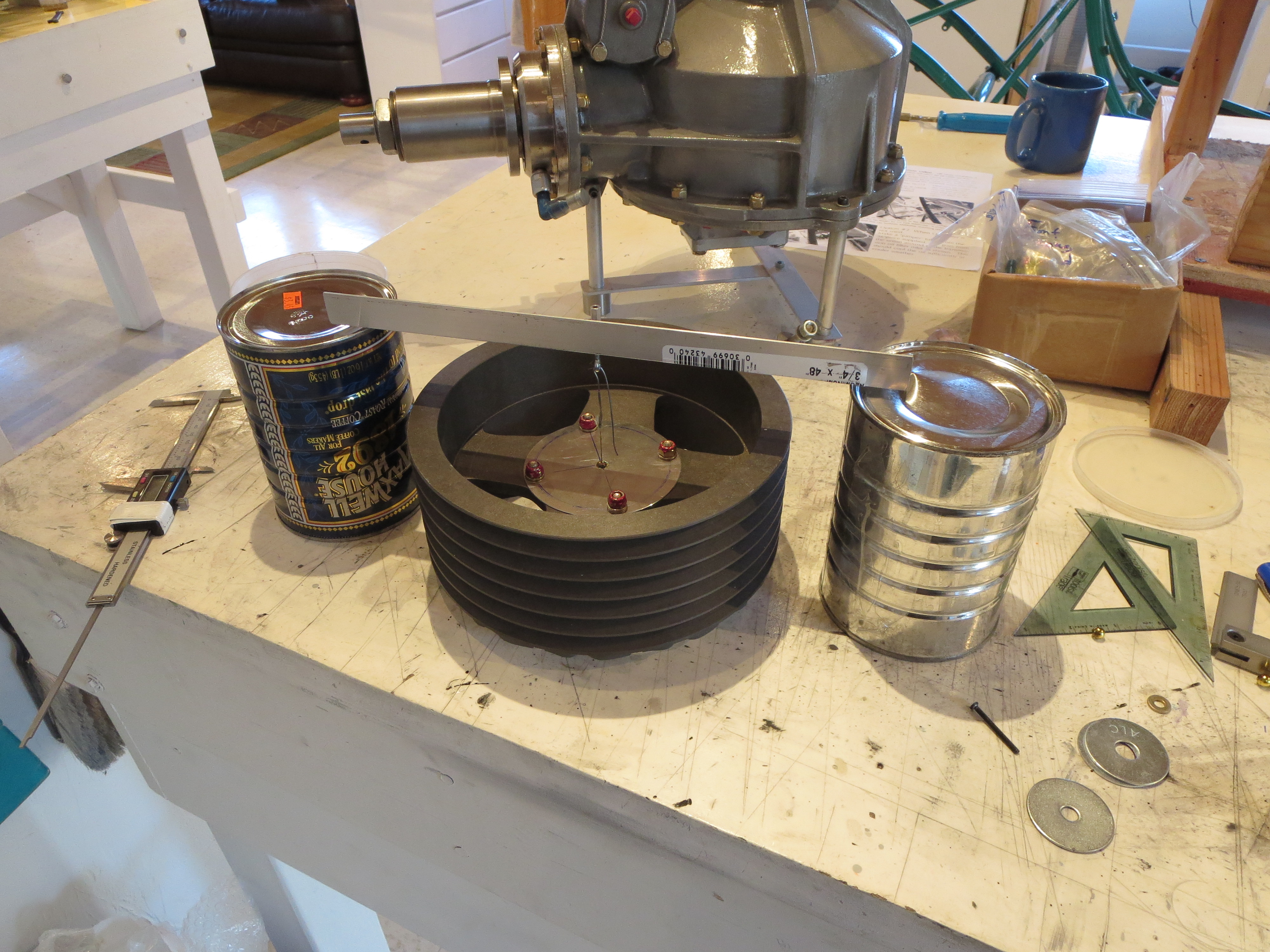 So I built a balancing jig. It's sized for the main transmission pulley and pretty basic. Some heavy stock for the sides and base and two sections of stainless steel ruler (Harbor Freight $1 items) for the "knife edges" sanded and polished on the edges.