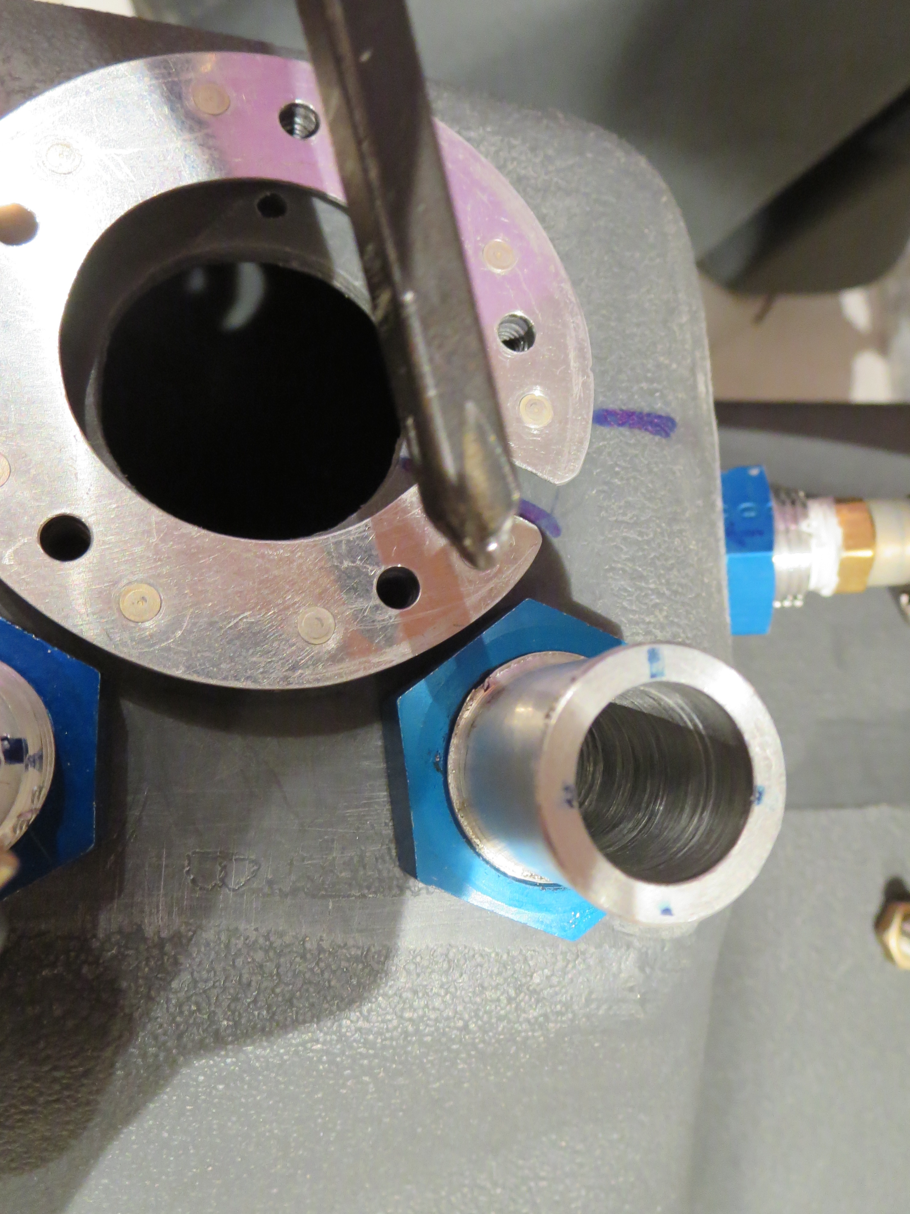 Here are the control tube mount tab locations when the front of the pan is flush against the mounting tabs. Pretty tight. I am going to shave a little off the inside of the round to fit the front plane of the pan down a hair lower.