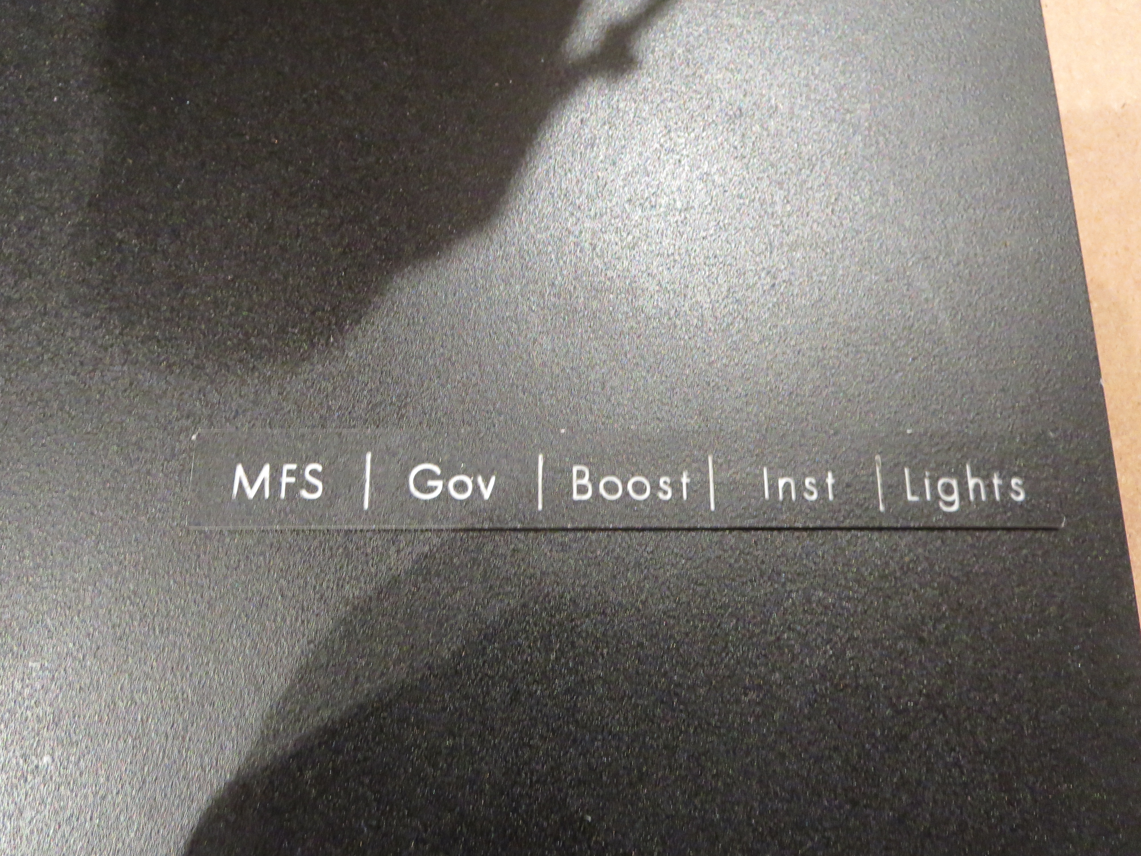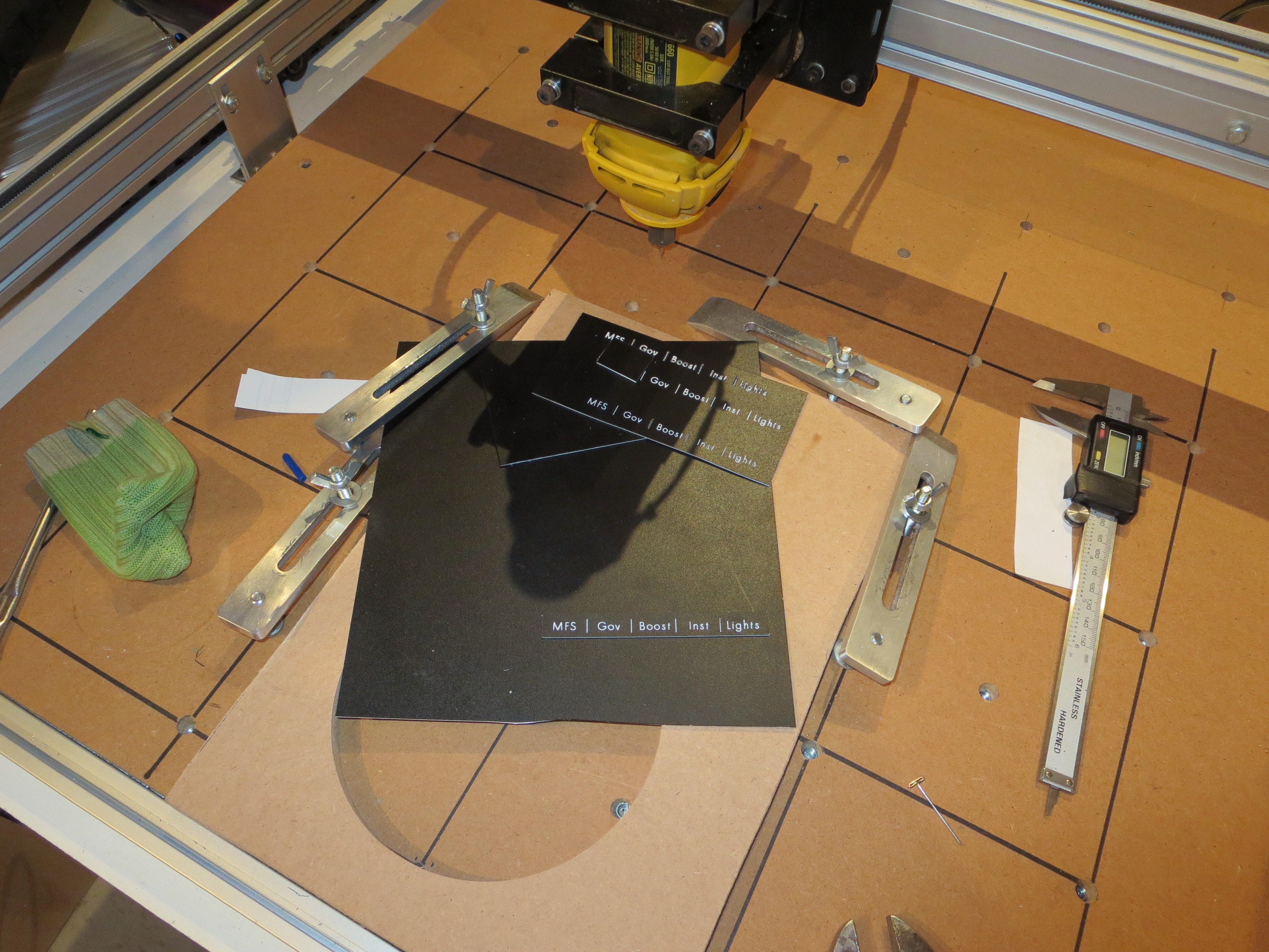 Paint the white sheets with a couple of heavy-ish coats of satin black, then route the labels with a very fine point engraving bit. It took a couple of tries to get the right bit and the correct depth, but I am quite satisfied with the results.