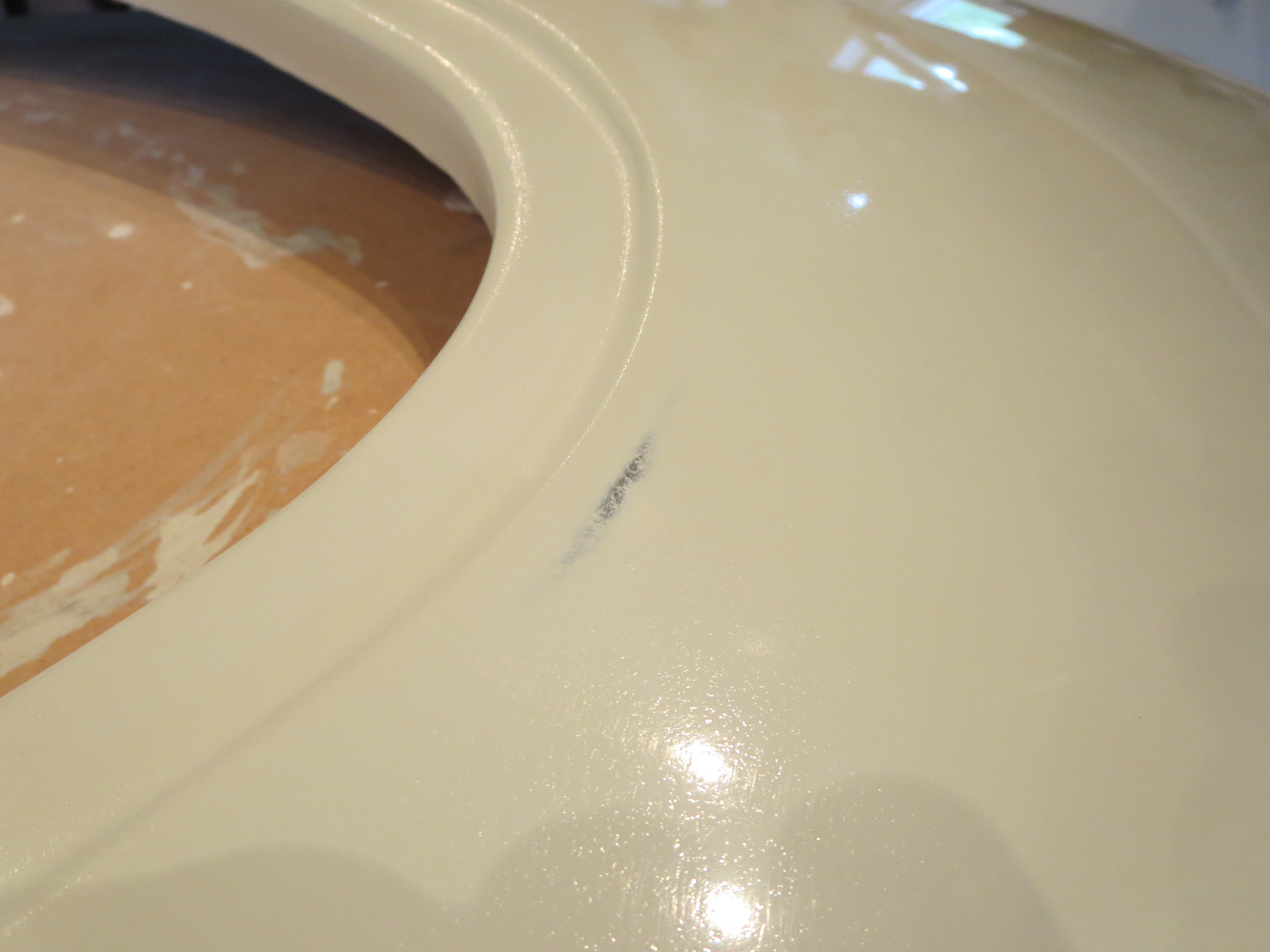 I cut the scribed slots in the fuselage halves. Overall the fiberglass looked sound, and there are just a couple of locations on the edges where the gelcoat got thick and there is a little separation between fiberglass layers. Those will get sanded out and a new strip of cloth or two added since they're right on the joggle lip mating surface and need to be strong. Gelcoat is non-structural. The interior is quite sloppy. There are a lot of little hairs and some places where resin pooled up. I will sand those down and probably be able to take down enough to compensate for the weight of my flox pads. Net sum zero on weight gain for my mods.